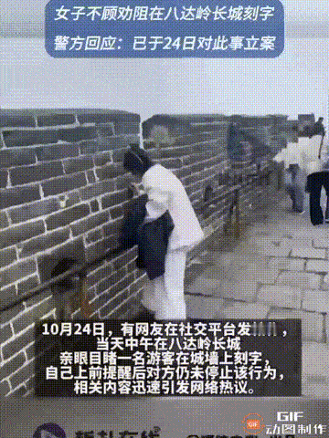 北京八达岭长城,一名女子拿起小石头在古城墙上刻字,一位游客看见后,好心上前劝阻,谁料女子丝毫不听劝,执意继续刻字,她的行为被其他游客拍下并上传网络后,也引起了八达岭长城景区工作人员的注意,表示她已经构成违法行为,目前警方也已经立案处理,网友看完这段视频,都觉得这名女子简直太无知了,这种人就不应该出门旅游,因为根据《长城保护条例》,禁止在城墙上刻划和涂污,同时《治安管理处罚法》也有规定,故意损坏国家保护的文物和名胜古迹,情节较重的将对其拘留5到10天,这名女子不仅不懂法律,也对好心劝阻的游客置之不理,因此最后造成的后果,也是她必须承担的代价。大家怎么看呢?