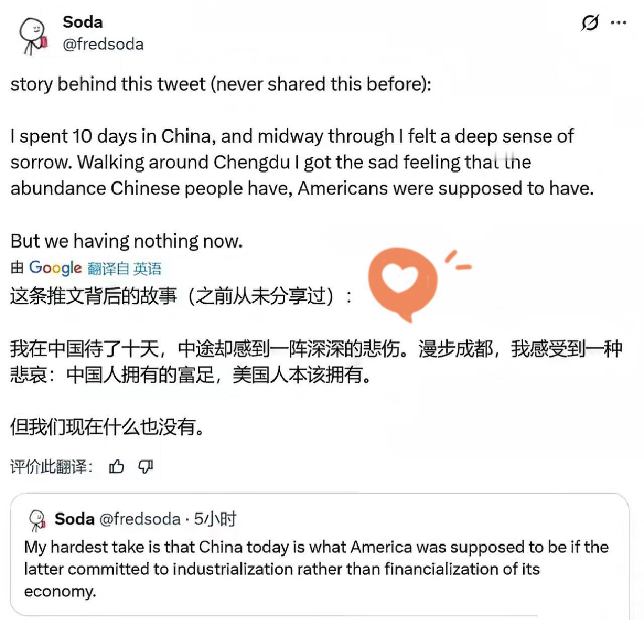 美国网友游中国十天后发文:中国人的富足,本是美国人该有的样子! 刷到一位洛杉矶网友的帖子,看得人心里五味杂陈——他来中国待了十天,逛成都时突然红了眼,说自己满是悲伤:中国人现在的富足生活,美国人本该也拥有,可现在啥都没抓住。 他说得直白又戳心:不是美国没机会,是当初嫌工业制造太辛苦,一头扎进金融化的泥潭里爬不出来。要知道,富足从不是靠打劫来的,得靠实打实的勤劳。现在美国人躺在过去的“打劫财富”上快吃空了,还想照搬老路子薅世界羊毛,根本是看不清现实。 这话说到点子上了:路是自己选的,有人踏实搞工业、拼实干,就有人贪快走捷径。中国今天的日子,从来不是天上掉的,是一砖一瓦干出来的。你身边有没有见过这种“踏实拼出来的富足”?来评论区聊聊你的感受!