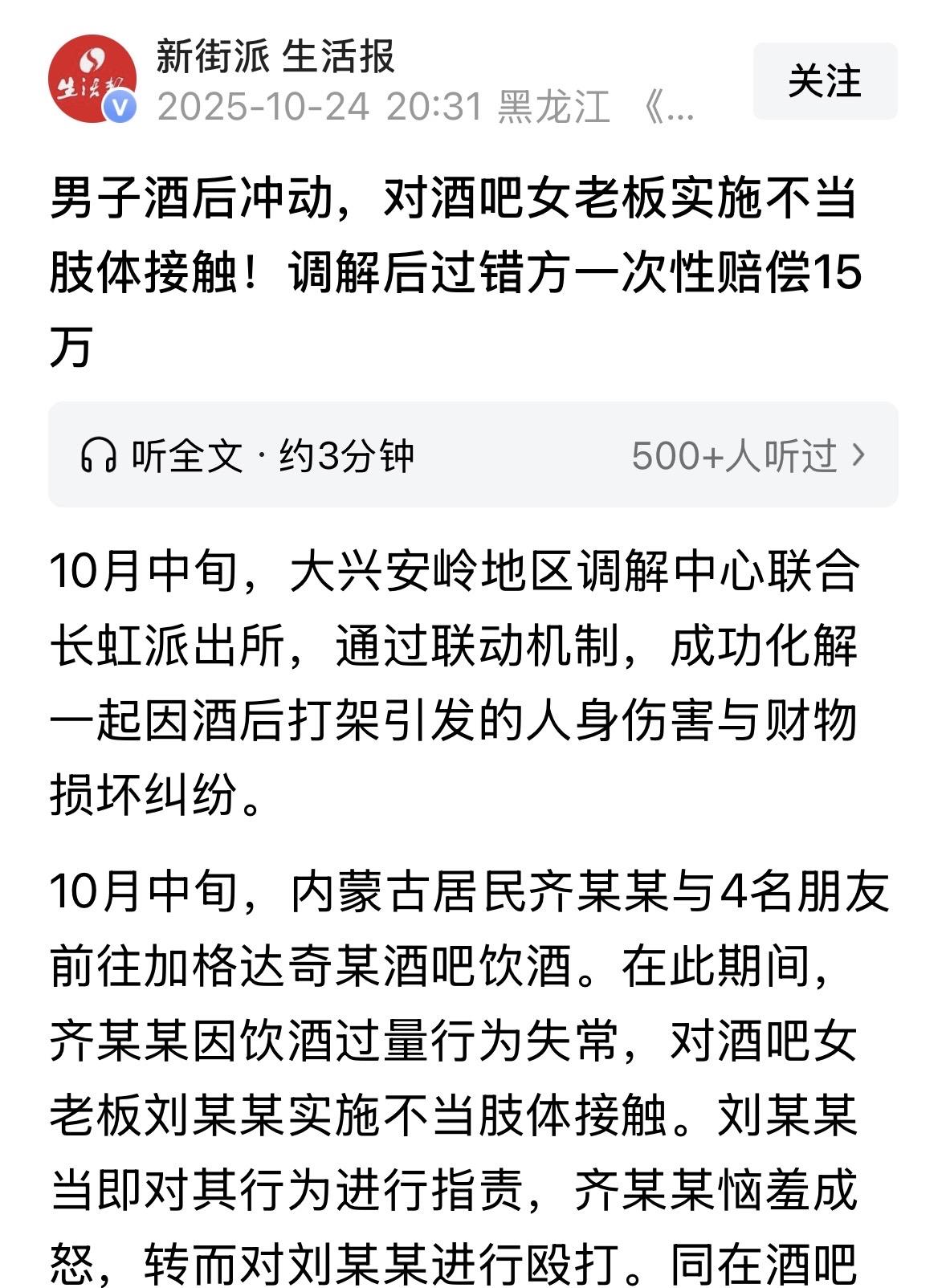 内蒙古,男子和4个朋友在酒吧喝酒,喝上头后,他看老板娘长得漂亮,就凑近对着她动手动脚,老板娘反应过来后大声斥责男子,却遭到男子殴打,另外2名男顾客看不下去了,上来将男子拉开,男子4个朋友却误以为2人是在挑衅,他们冲上来就对着2人和老板娘一顿打,还把酒吧桌椅酒水砸的满地都是,结局出乎意料。 10月中旬,齐某某和4个朋友相约,一头钻进了一家热闹的酒吧。 酒吧里灯光闪烁,音乐嘈杂,齐某某他们围坐在桌边,一杯接一杯地灌着酒。 几轮下来,齐某某的脑袋就有些晕乎了,眼神也变得迷离起来。 酒精上头,他的行为渐渐失了分寸。看着在吧台后忙碌的漂亮女老板刘某某,他竟鬼使神差地伸出了手,做了些不恰当的肢体接触。 刘某某正忙着招呼客人,突然感觉被人冒犯,又惊又怒。 她猛地往后退了一步,脸色涨得通红,指着齐某某大声斥责:你这人怎么回事,怎么对人动手动脚的? 这一声指责,让齐某某的自尊心受了挫,他觉得自己在大家面前丢了面子。 齐某某瞬间恼羞成怒,原本摇摇晃晃的身体突然爆发出一股蛮劲,挥起拳头就朝刘某某砸了过去。 酒吧里的人都被这突如其来的一幕惊住了,就在这时,坐在不远处的顾客顾某某和吕某某听见动静后也望向这边。 他们都是热心肠的人,看到有人欺负女人,哪能坐视不管? 两人几乎同时从座位上起来,三步并作两步冲到齐某某身边,用力把他推开,嘴里还喊着:住手!打女人算什么本事! 可他们这一番见义勇为的举动,在齐某某那4个喝得晕头转向的朋友眼里,却完全变了味。 他们看到自己的朋友被人动手,也不管三七二十一,立刻跳了起来,扯着嗓子吼道:你们干什么?敢欺负我兄弟! 话音未落,他们就冲向顾某某和吕某某,连带着原本是受害者的刘某某也被卷了进去。 一时间,酒吧里乱成了一锅粥,喊叫声、打斗声、桌椅翻倒的声音交织在一起,现场秩序完全失控。 等这场混乱终于平息下来,刘某某、顾某某和吕某某3人都已经不同程度地受了伤,挂了彩。 再看酒吧里,桌椅东倒西歪,酒水洒了一地,玻璃碎片到处都是,一片狼藉。 事情发生后,双方就赔偿问题吵得不可开交。齐某某他们觉得自己是喝多了,又不是故意的,不愿意赔那么多钱。 而刘某某他们则觉得自己的身体受了伤,酒吧的财物也被损坏,必须要有个说法。 双方各执一词,谁也不肯让步,矛盾越来越深,眼看着就要闹到不可收拾的地步。 派出所的民警接到了报警电话后赶到了现场。 为了尽快化解这场纠纷,派出所又联合了调解中心,共同来处理这件事。 调解团队考虑到双方现在情绪都很激动,直接让他们坐在一起谈肯定谈不出结果,于是决定采取“分开沟通”的策略。 他们先把齐某某和他的4个朋友叫到了一边,拿出《治安管理处罚法》和《民法典》,一条一条地给他们讲解,告诉他们酒后滋事、殴打他人是违法的行为,不仅要承担民事赔偿责任,情节严重的还可能被治安拘留。 另一边,调解员又耐心地给刘某某、顾某某和吕某某3人做工作,告诉他们调解是一种比较快捷、有效的解决方式,通过合法的途径表达自己的诉求,才能更好地维护自己的权益,避免矛盾进一步激化。 等双方的情绪都平复了,也都表达了愿意调解的意愿后,调解团队才把他们叫到了一起,进行面对面的协商。 经过调解,齐某某他们当场向刘某某、顾某某和吕某某3人诚恳地道歉,并且一次性赔偿了他们医疗费、误工费以及酒吧的财物损失,总共15万元。 双方还签订了调解协议书,明确了赔偿款的支付时间。 有人看后不禁发出疑问啊,说这是互殴,还能调解?不是先拘留再调解? 这不是调解而是妥妥的和稀泥,寻衅滋事至少行政拘留,性质恶劣、情节严重应该追究刑事责任。 那么,从法律角度,怎么看待这件事? 《民法典》第1165条规定:行为人因过错侵害他人民事权益造成损害的,应当承担侵权责任。 齐某某饮酒过量后行为失常,对酒吧女老板刘某某实施不当肢体接触,在被指责后恼羞成怒转而殴打刘某某,这一系列行为明显具有过错。 齐某某的4名朋友共同对刘某某、顾某某、吕某某三人进行殴打,同样存在过错。 刘某某、顾某某、吕某某三人身体受到伤害,酒吧也经历了财产损失。 这些损害结果与齐某某及其朋友的行为之间存在直接的因果关系。 根据规定,齐某某及其4名朋友应当承担侵权责任。对于刘某某、顾某某、吕某某3人的医疗费、误工费等损失,以及酒吧的财物损失,侵权人负有赔偿义务。 对此,你怎么看? 关注@运良说法. 学法律知识不迷路