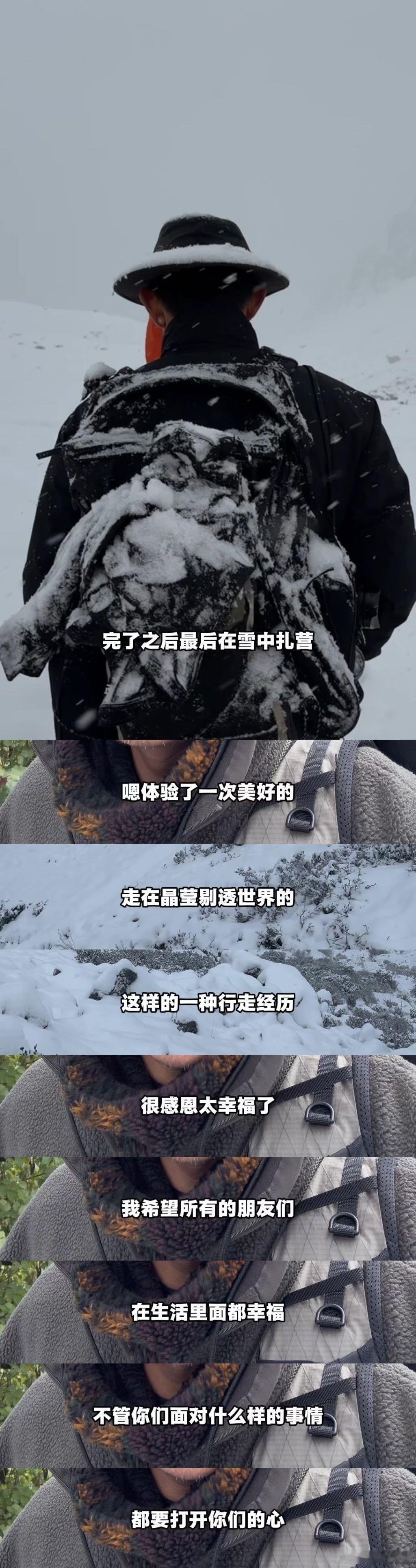 陈坤在大雪中徒步走了八小时从松潘客栈扎进雪山,8小时风雪浸肩,背包凝霜仍向前。15年行走懂了:沉与冷皆可破,心向蓝天,终能踩碎冰雪,走出透亮光程。 ​​​