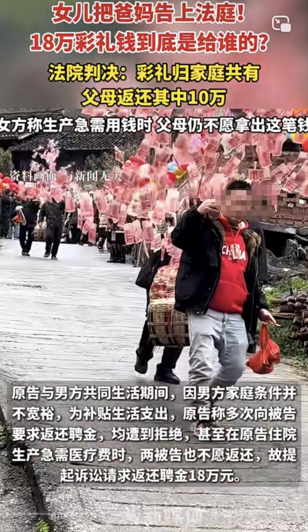 国内首例女儿告父母要求返还结婚彩礼 浙江台州这姑娘好样的,自己的彩礼要自己做主,结婚的时候说是说父母帮忙保管18万元彩礼钱,可到了女孩生产急用钱救命的时候,父母却不愿意拿出钱,这就有些过分了,女子一气之下将父母告上法庭,法院认定这笔钱由家庭共同所有,最终判决女子父母返还其中10万元,只是这父母与女儿的亲情估计就会因为这8万元,走到尽头了! 在我的理解里面,如果女方家庭实在是困难,女方彩礼给老人养老生活也是情有可原,毕竟父母养大孩子也不容易,俗话说“养父防老”嘛,但这个案子,女儿嫁的男方家庭也不富裕,尤其是生孩子的时候都不拿钱,难道女儿和外孙的命还不如这十来万彩礼值钱? 大概率这个家里有哥哥或者弟弟,父母想把嫁女儿的彩礼钱留着给男孩,不然不可能不拿出来,毕竟现在这社会,大部分女孩出嫁父母是不会要求要一分钱彩礼都让女孩带走,留给他们的小家,如果条件好的,反而还置办了嫁妆和陪嫁,这家父母还是有些偏心了! 这事儿在有的人眼里看来“这不就是卖女儿”吗? 有的人认为“女孩不孝顺,恋爱脑,死心眼,将来日子也不会过的好,住院生娃不应该让男的提前准备好钱,怎么这个时候想着父母这里的,这个应该留到将来用,即使现在父母把钱给她了,她也护不住,以后的日子肯定会很苦很苦,降不住婆家的人”! 对此,你们怎么看呢?