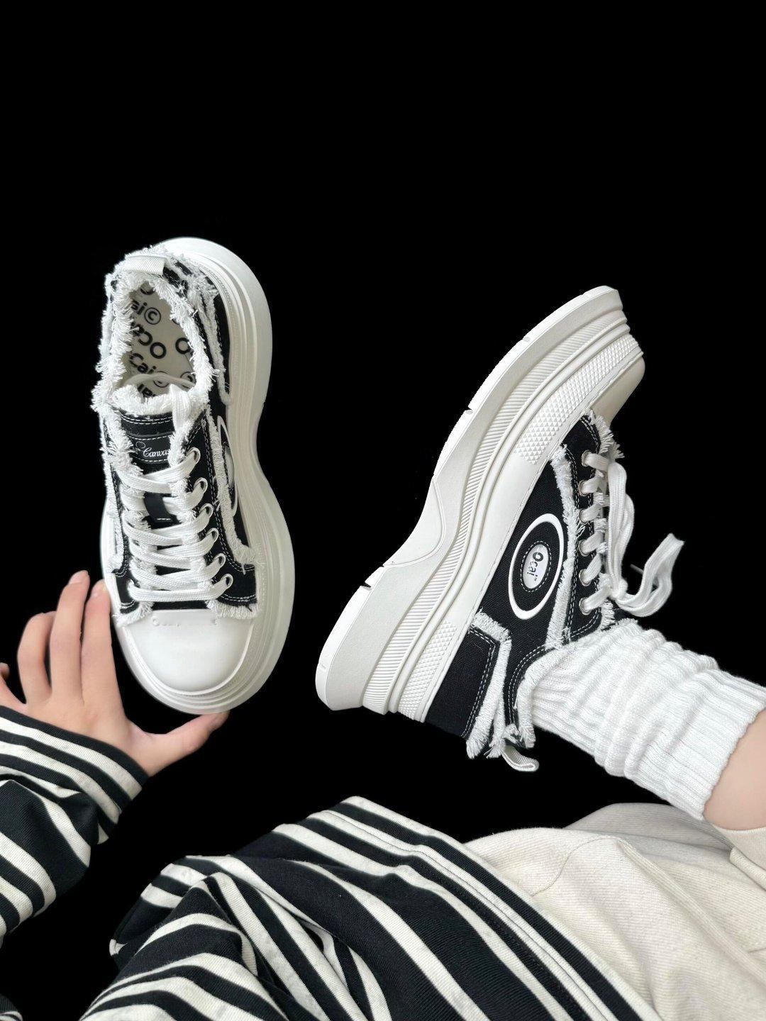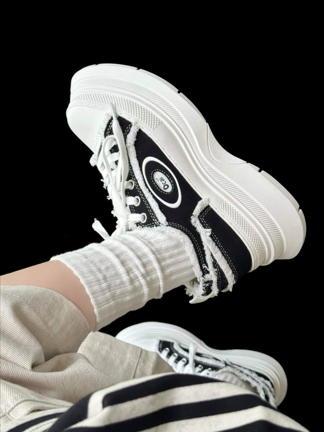 Ocai这双帆布鞋,简直把法式慵懒的松弛感刻进了设计基因里。黑白主调的配色干净又高级,像极了巴黎街头随性的穿搭美学——拼接织物的肌理自带复古质感,鞋身边缘的流苏毛边更添了几分不刻意的松弛,仿佛刚从左岸咖啡馆的台阶上走下来,漫不经心就踩中了时尚的节奏。