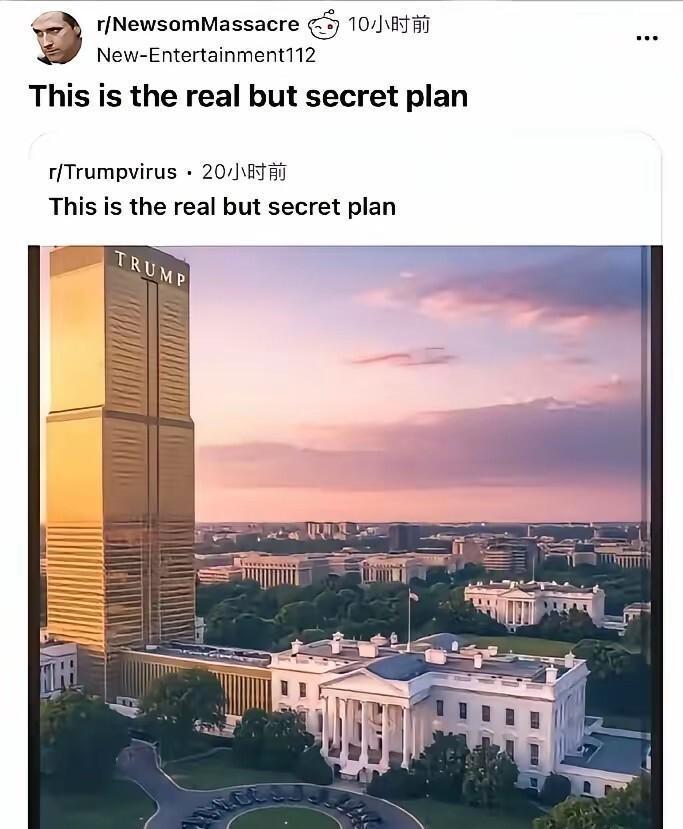 美国人民终于觉醒了。 他们好像嗅到了特朗普的阴谋。阴谋论开始在美国网络上泛滥。很多美国网友画了这么一张图。特朗普大厦金光闪闪的压在白宫头顶。原来特朗普拆白宫的目的是要建自己的特朗普大厦呀。 这图可真是画到点子上了。特朗普当年在纽约建特朗普大厦的时候就玩过这招。他看中第五大道和57街那个蒂凡尼转角。那是全世界最贵的地段。硬是拆了有百年历史的邦威特泰勒百货商店。建起了他那座58层的金色大厦。连外墙都要用黑色玻璃加镀金框架。 就怕别人不知道他有钱。现在他对白宫也是这个路子。白宫东翼那座122年的老建筑。三天时间就被铲平了。砖石瓦砾直接拉去他的高尔夫球场填坑了。历史学家说得对。他这不是在修总统官邸。是在建特朗普大厦。要刻上他自己的名字。 说起来这土地产权问题可真是一团乱麻。白宫的地是国家的。可上面建筑是特朗普自己掏2.5亿建的。还是私捐的。亚马逊谷歌这些巨头都出了钱。前白宫法务顾问说得直接。这就是道德噩梦。 企业为啥掏钱。能对政府没诉求吗。特朗普还炫耀说不用审批。他今晚就能开工。这可是白宫啊。但他说了算。这操作跟他当年在纽约一个路子。总爱钻空子。纽约法官去年就裁定他欺诈。说他经常夸大资产价值骗贷款。 看看特朗普大厦里面那样子。就能猜到他想把白宫搞成啥样。他的复式豪宅全是明晃晃的金色。巴洛克洛可可宫廷式设计。所有装饰都镶着24K黄金。他改造白宫椭圆形办公室时也是这个审美。浅色缎面壁布加金黄色窗帘。还加了大量鹰元素。现在拆了东翼要建的新宴会厅。设计图更是金碧辉煌。浮夸的欧式拱门镜面天花板。跟海湖庄园一个调调。 更绝的是外国官员租用特朗普大厦这事可能让他涉嫌违法。美国宪法禁止官员未经国会同意接受外国政府的钱。可特朗普上任后还有外国官员继续租他的公寓。这问题可大了去了。 希拉里这次骂得对。白宫不是特朗普的私宅。他凭什么毁掉它。白宫是国家历史地标。1966年就有《国家历史保护法》规定这种历史地标改造要经过专门委员会评估和公开征求意见。可特朗普的程序全是漏洞。评估报告公开意见什么都没见着就开工了。 各位读者你们怎么看。欢迎在评论区讨论。