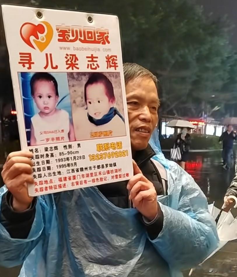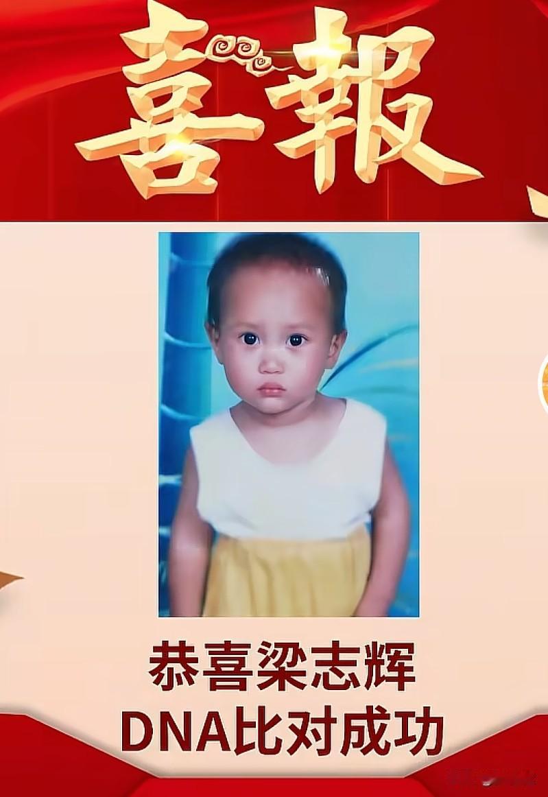 好消息,梁志辉找到了,DNA比对成功了! 梁志辉是在1995年的秋天,在福建省厦门市湖里区禾山镇枋湖村一间出租屋外失踪,当时年仅2岁8个月。父亲梁三寿自1995年起开始长达30年的寻子之路,足迹遍布全国20多个城市。 梁志辉你一定要回家,好好的陪爸爸,他为了找你付出了半辈子,吃馒头,睡桥洞,吃的苦是常人难以想象的。 好期待他们父子的相见!