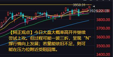 【10月27日A股盘前分析:今日大盘大概率高开并继续尝试上攻】 周五大盘高开高走,指数再创年内新高。成交量的放大也有助于消化抛压,增强上涨的持续性。市场情绪面和投资者信心在逐步回暖…… 【今日分析】今日大盘大概率高开,且有继续尝试上攻的可能。 消息面上:中美贸易磋商释放积极信号。一是达成了基本共识;二是磋商范围广泛;三是基调积极。本次磋商大大降低了短期内经贸关系再度恶化的风险。 接下来的重要事件就是APEC会议,以及美联储议息,靴子也将基本落地。 本周是三季报披露的最后一周,业绩雷不会少,传统的白酒行业许多名酒都选择了最后一天公布业绩,这对市场也是一大考验。最后两天有超2000家上市公司集中公布三季报,可以预见后半周的大盘走势不容乐观。 技术面上:上周五上证指数收盘创出新高,跳空突破了前期的震荡区间,技术形态呈现突破态势,但由于目前远离5日均线,存在一定的乖离率修复要求,且跳空缺口的支撑有效性需要观察(通常以3个交易日不回补为强势信号)。同时,量能虽有大幅放大,但依然未破2万亿,后续若能持续温和放量,将支撑行情向上发展;反之,若能量依旧不足,则可能在压力位附近受阻回落。 指数层面:大盘日线多空分水岭3946点。上证指数上行的压力位先看3960-3965点区间,再看3980点附近;支撑位先看3935-3945点区间,再看3980点附近。 走势特征:今日市场预计会尝试上攻,但过程可能一波三折,呈现“N”形震荡的特征。 热点方向:核心主线AI产业链(如GPU、光模块、存储芯片、半导体设备、智能驾驶、人形机器R); 商业航天、可控核聚变、量子通信也可保持关注。 操作策略:若大盘继续上攻至3960-3980点压力位且量能不足,可考虑适当减仓,锁定部分利润;若股价始终运行在5日均线之上,可继续持股,或对强势股进行高抛低吸。若大盘回踩3935-3945点支撑区域出现企稳迹象,可以分批布局热点方向的核心个股。 【综合判断】今日大盘大概率高开并继续尝试上攻。但过程可能一波三折,呈现“N”震荡特征。量能持续放大,将支撑行情向上发展;若量能依旧不足,则可能在压力位附近受阻回落。 我写精品,你来点赞,相互支持、携手共进。 (个人观点,仅供参考,据此操作,责任自负)