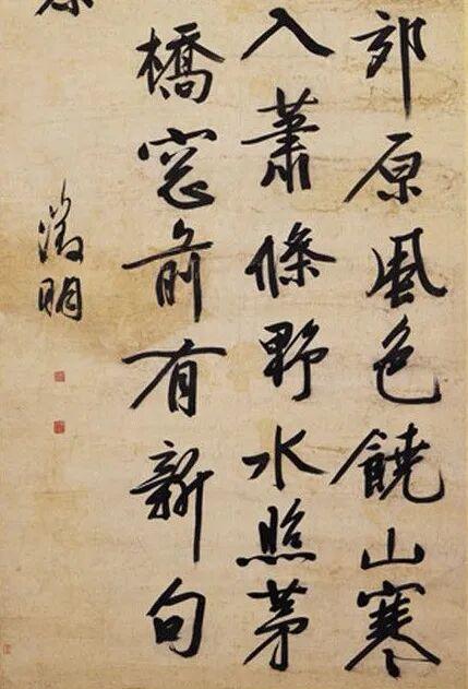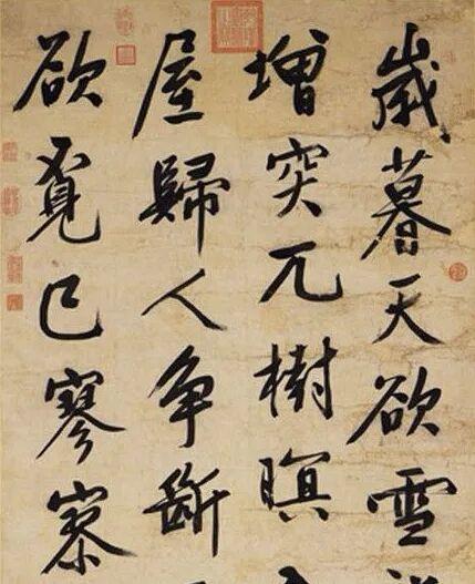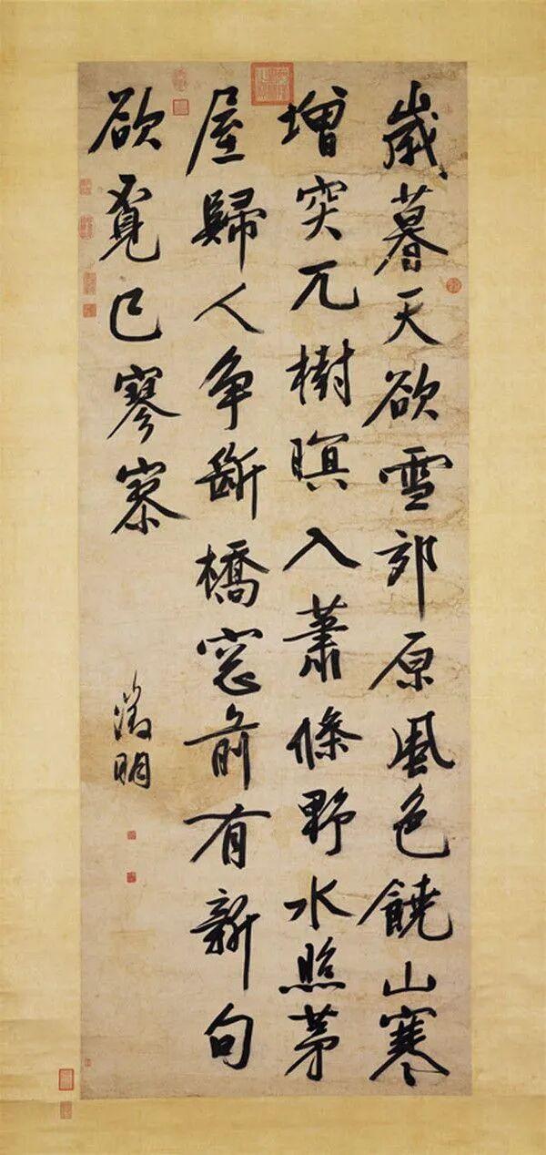 文徵明《岁末天欲雪》释文: 岁暮天欲雪,郊原风色饶。 山寒增突兀,树暝入萧条。 野水照茅屋,归人争断桥。 窗前有新句,欲觅已寥寥。 岁暮的暮色里,雪意正悄然漫过远山。寒风在旷野上打着旋儿,卷着枯草掠过郊原,连松针都凝着冰晶。远山如铁铸般冷峻,老树在暝色中愈发萧索,枝桠间漏下几缕苍青,仿佛被冻住的叹息。寒塘倒映着茅屋的剪影,檐角垂落的冰棱正将暮色割成碎片。 忽闻断桥传来踏雪声——归人踏碎薄冰,身影在暮色中匆匆如雁,衣袂间还沾着未化的霜粒。案头新句初萌,待寻时却已消散在雪意朦胧中,唯有砚池里的墨痕,还在固执地洇染着半阙残诗。 文徵明《岁暮天欲雪》行书,属其晚年成熟期风格,兼具“玉版十三行”的精雅与自身行书的温润,与诗意的萧瑟静谧高度契合。 笔法上,以中锋行笔为主,线条劲挺却无生硬感:“雪”“寒”等字的竖画挺拔如孤松,起收笔藏露结合,如“郊”字首笔露锋轻入,末笔回锋收束,显灵动意趣;转折处多圆转处理,如“树”“桥”的折笔,柔中带刚,暗合冬日郊原“风色饶”却不凛冽的意境。 结体上,字势端庄稳健,疏密对比精妙:“野水照茅屋”五字,“野”“屋”笔画疏朗,“水”“照”笔画紧凑,形成视觉节奏;字形多呈扁方,如“归”“人”,宽博舒展,消解了诗意的孤寂感。 章法上,行距宽于字距,墨色浓淡相间,偶有枯笔(如“寥寥”二字),似冬日淡墨晕染,既保持了文人书法的雅致,又以笔墨节奏呼应“天欲雪”的朦胧、“归人争断桥”的动态,实现了“诗”与“书”的浑然一体。