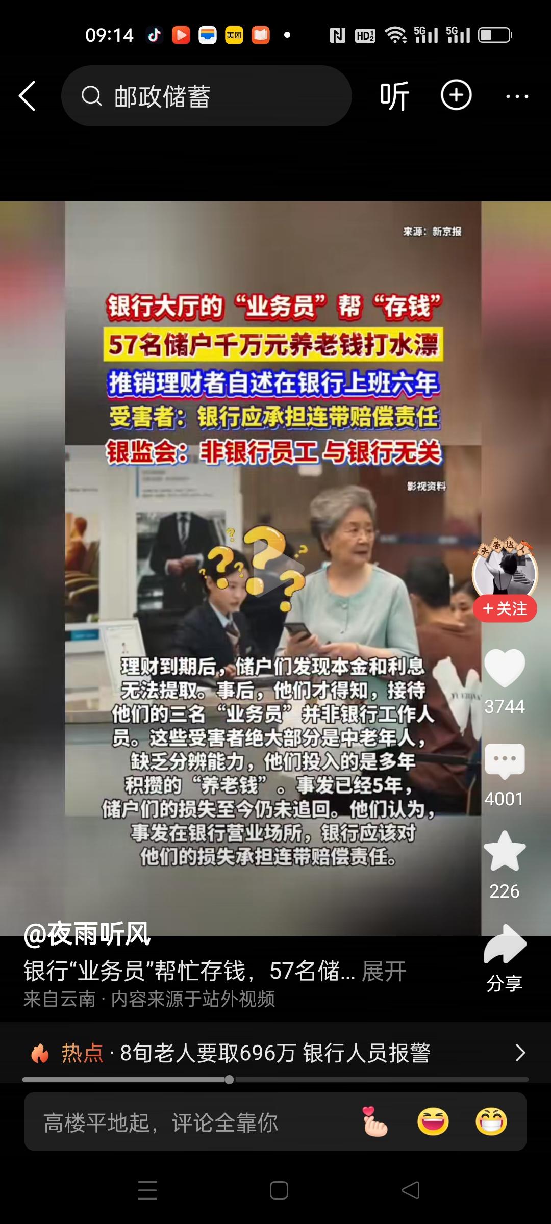 在银行场所内打着帮老人存钱的名义,实则购买理财产品,致使57名老人千万元养老钱打水漂。 老人们去找银行,银行说不是他们工作人员,与银行无关。 不是银行工作人员,为什么在银行里面活动,还无人制止,还给他们办理业务。这个银行绝对脱不了干系。 非银行工作人员,银行有责任甄别驱离,以保证储户安全。不是让客户自己去区分。 受害者应该去起诉维权!