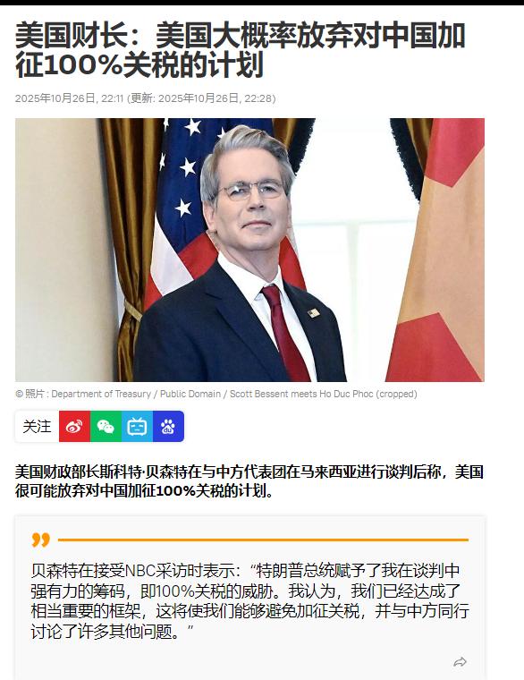 美财长:中美谈判后,“100%对华关税”方案已被排除! 美国财政部长斯科特·贝森特在与中方代表团在马来西亚进行谈判后称,美国很可能放弃对中国加征100%关税的计划。 值得一提,在会谈中,美方表达立场是强硬的,中方维护利益是坚定的。 而会谈后,老美明显临阵退缩了,应该是没牌可出了。 现在老美投降,还可以拿到一个不错的待遇,过两年可就越来越少了。