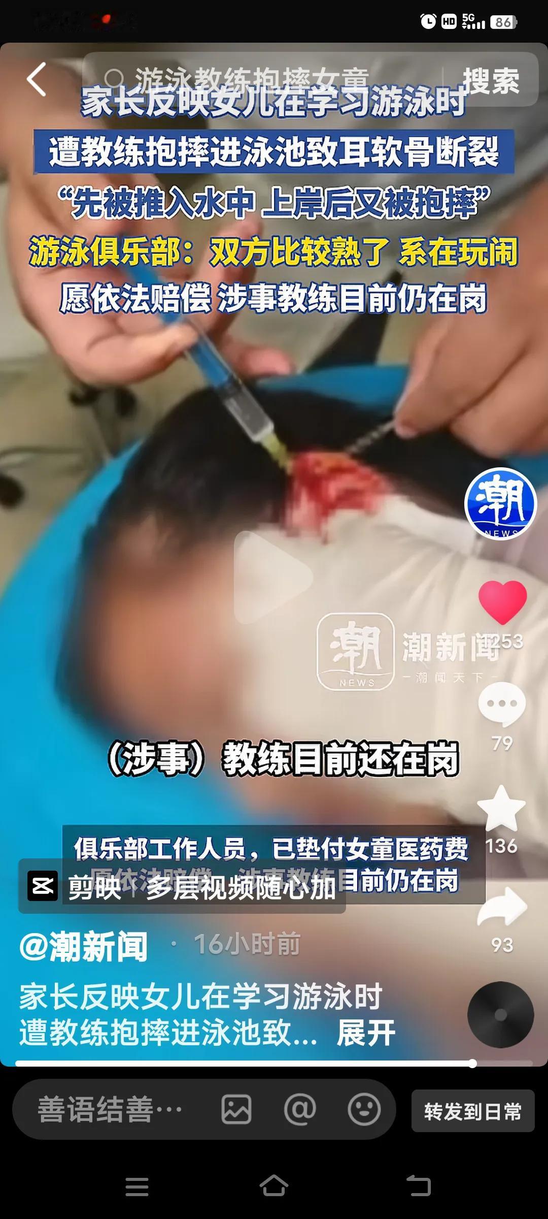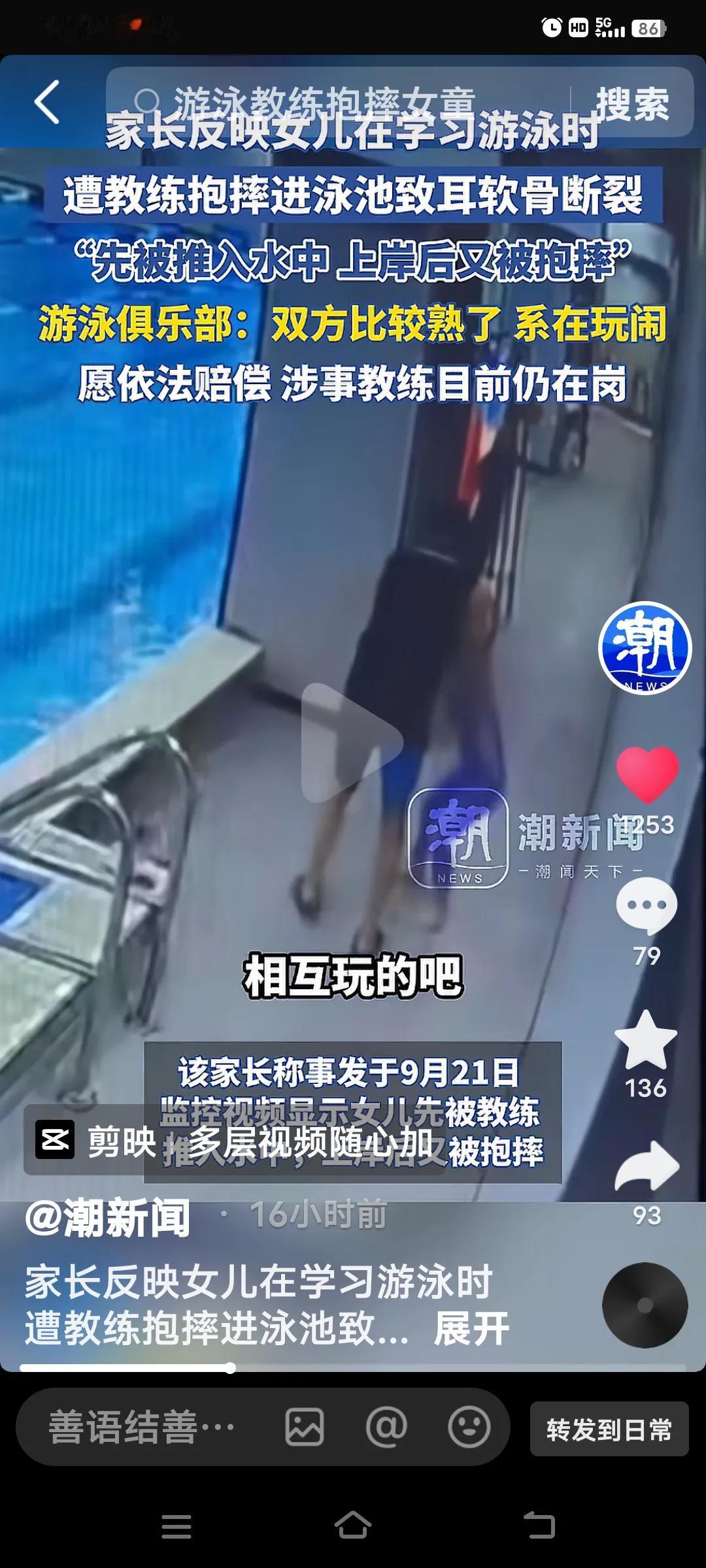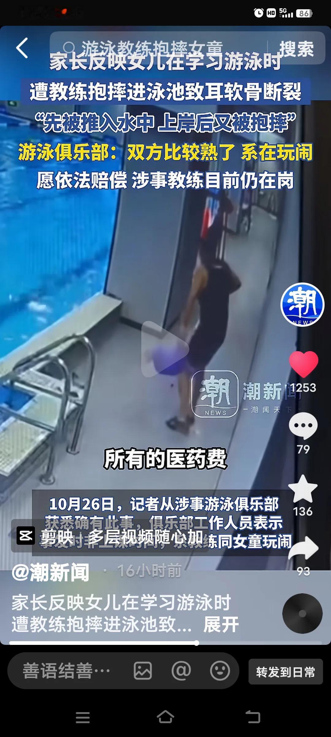 南京这事儿着实令人恼火!10月26日有家长反映,9月21日其女儿在游泳俱乐部学游泳时,被教练抱摔进泳池,致使耳软骨断裂。监控画面显示,教练先是将孩子推进水里,待孩子上岸后又实施了抱摔行为。 涉事俱乐部声称这是教练在和孩子玩耍,称教练与孩子比较熟络,还表示教练垫付了医药费,且该教练仍在岗。然而,女童母亲却表示,孩子缝了几针,所有医药费均是自己支付的。 孩子受了这么大的罪,玩笑岂能随意开?稍有不慎便会酿成灾难!这赔偿问题必须认真协商,给家长和孩子一个合理的交代。