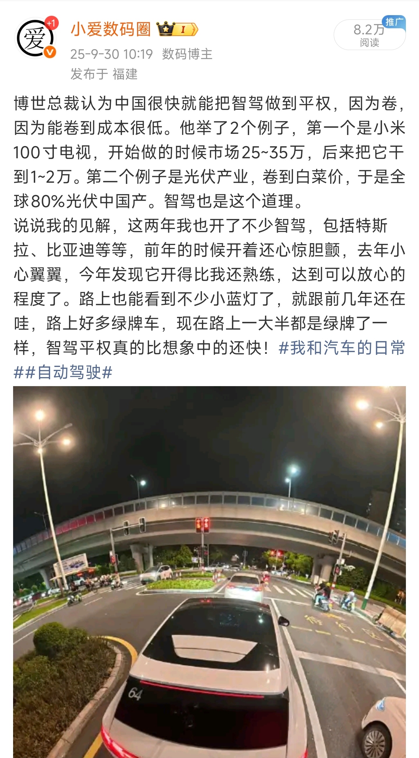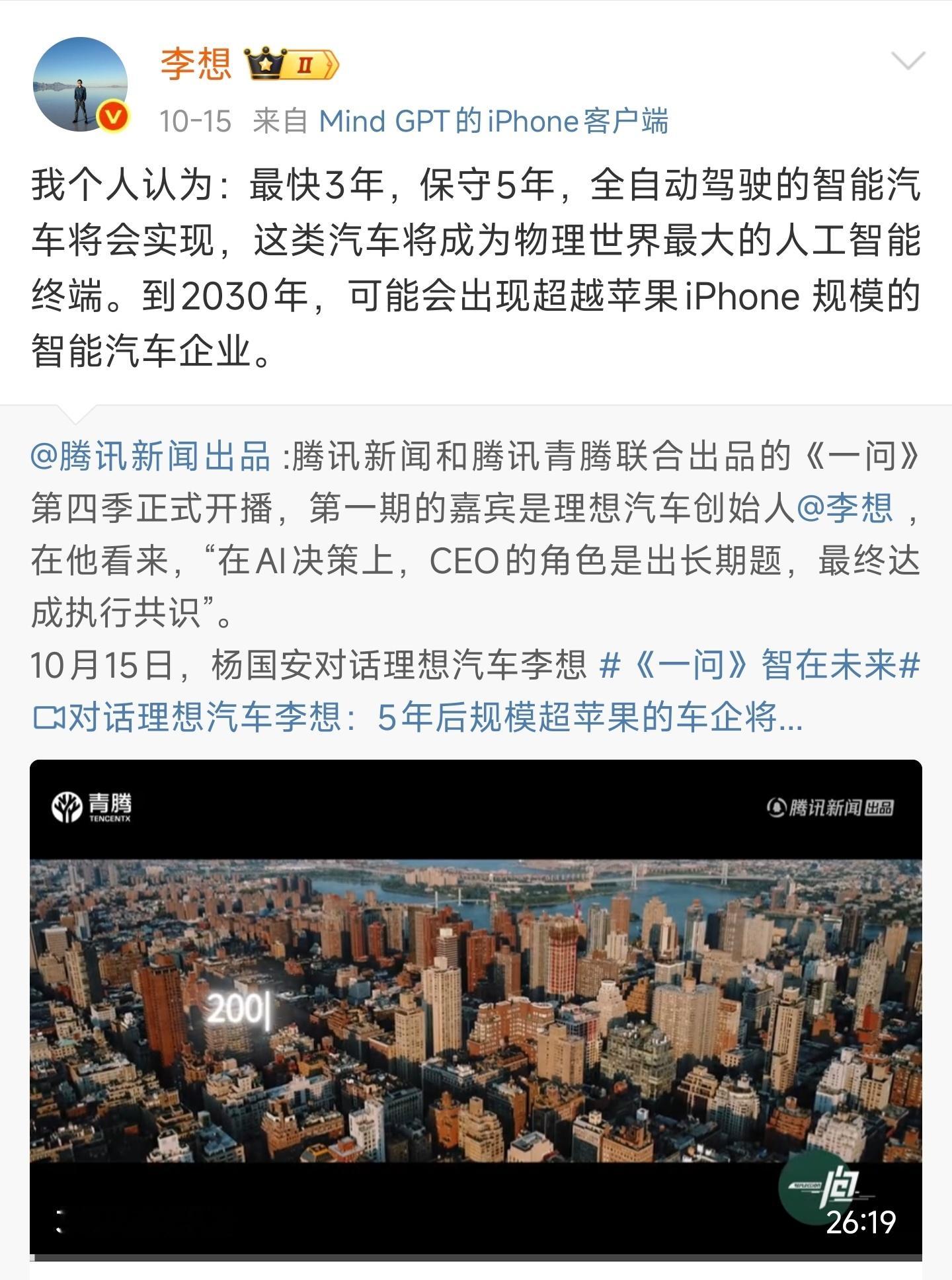 你看,理想的李想说全自动驾驶汽车最快3年,保守5年!是不是验证了我前几天说的话,自动驾驶比想象中的还快!上个月开着腾势我都感觉很多时候车开得比我还溜,尤其是陌生的路段,我会开错它不会!路上的小蓝灯会越来越多,量与质的转变!自动驾驶汽车科技