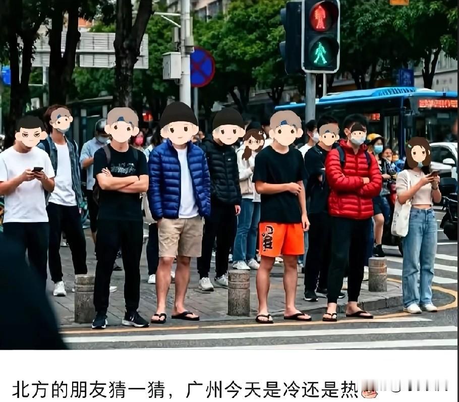 广州今天这时候是冷还是热了,上穿面,下穿拖,这是冷是热啊,给我整不会了。广东早上晚上可能有点冷,中午的话可能穿适合个短袖。我发现广东人有一个奇怪的现象,上半身捂得死死的,下半身短裤加拖鞋。现在广州这种天气,我喜欢上半身长袖下半身短裤。又到了广东人乱穿衣服的时候了,这一下子就看出短袖是本地人,羽绒服是外地人。