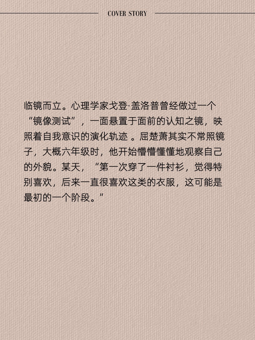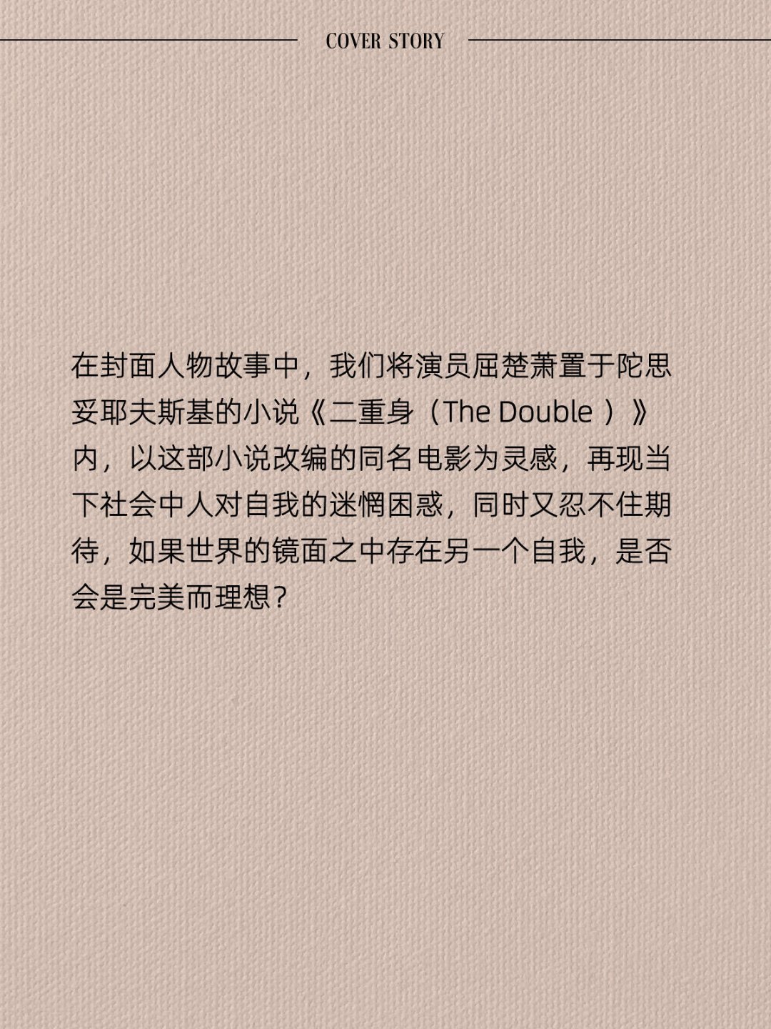 于创作者眼中,屈楚萧外貌具强可塑性,张力尽显,成为灵感之源。然外界常以其为角色形象参照,他却始终清醒,明晰镜像与本体之别。编剧笔下以其为蓝本之角色,不过是他人想象碎片的投射,而他,正越过镜子,坚守自我本真。屈楚萧GLASSMAN秋季刊封面屈楚萧镜中之我