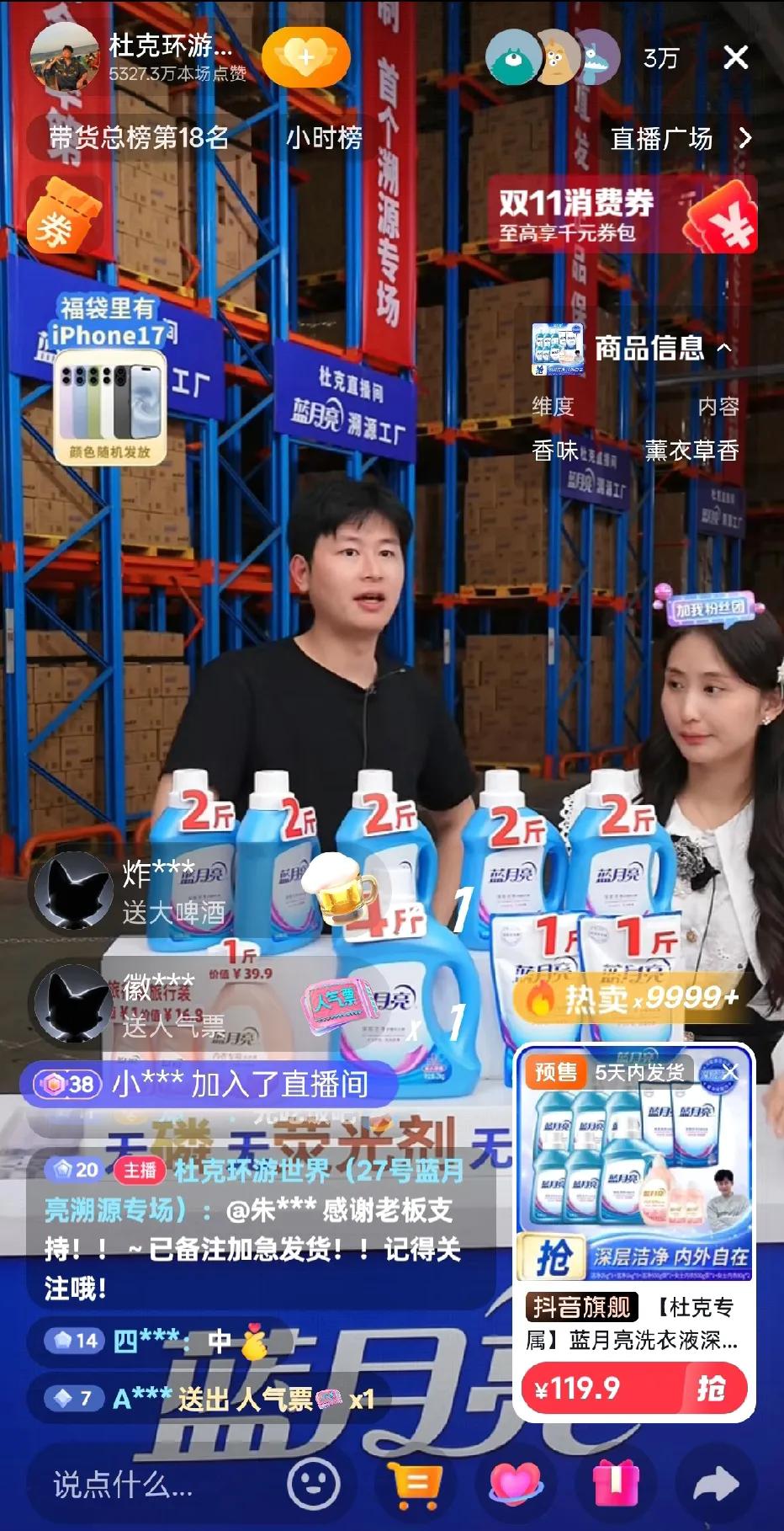 “我带货是很能挣钱,但是我说过了,我不带货了”这是之前刷到杜克在一场直播里说的,不过,今天,杜克回归啦,刚打开抖音,看到正在带货,直播间有3万多人,正在卖蓝月亮的产品,显示热卖x9999+,这人气真不是盖的,好多人下单,都挺支持杜克的!看来这一场下来,数据应该挺高,又有收入啦。 不过,还是恭喜杜克,毕竟,每个人都要生活,人家有这个能力,干嘛不带货呢?对不对?没有对与错。就是,杜克的视频能不能快点更新一下[呲牙]更新的太慢了。