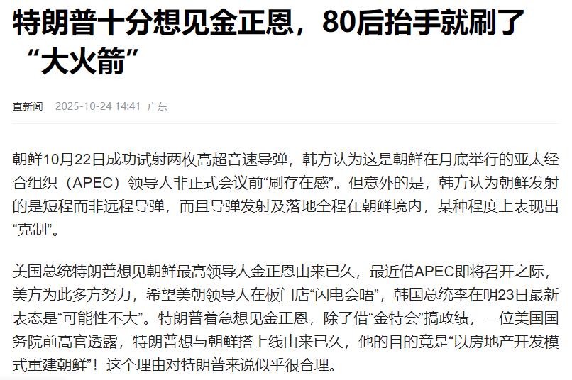 特朗普再次表态“愿见金正恩”,朝鲜释出罕见信号,这回真能成了?   当地时间10月25日,美国总统特朗普正乘坐“空军一号”专机飞往亚洲,途中面对随行记者的提问,他清晰地表示,如果朝鲜最高领导人金正恩做好了接触的准备,想要跟他传递什么信息,自己愿意抽出时间与金正恩见面,认真听听朝方的想法。   这一表态距离两人上一次公开互动已经过去了好几年了,也让原本停滞不前的美朝高层沟通,突然透出了一丝新的可能性。而要弄明白这次表态的意义,得先回头看看美朝谈判的过往。   2018年的时候,双方在新加坡举行了历史性的会晤,那是美朝领导人首次面对面坐下来谈,当时还达成了关于无核化和构建和平机制的初步共识,让不少人都对美朝关系改善抱有期待。   可好景不长,到了2019年的河内会晤,双方在具体怎么推进共识上没能谈拢,没取得实质性的突破。从那之后,不仅高层会面没了下文,就连工作层面的接触也陷入了停滞,制裁和反制成了双方互动的主要方式。   而这次特朗普主动释放愿意见面的信号,刚好赶上美国国内政治周期变化,东北亚地区的安全格局也在调整,他的表态里既有着对地区事务的关注,也藏着国内政治层面的考量。   更有意思的是,朝鲜方面近期也通过官方渠道给出了罕见的回应。   据朝鲜中央通讯社报道,朝鲜外务省的官员在公开场合提到,“对话解决问题的大门始终是敞开的”,但同时也强调,对话“必须基于平等和相互尊重的原则”。   这番话既延续了朝鲜之前一直坚持的立场,又没有把接触的路堵死,算是给潜在的沟通留了余地,和特朗普的表态形成了一种微妙的呼应。   但话说回来,领导人会晤要真正实现可没那么容易。从过去的经验就能看出来,美朝双方在几个核心议题上的分歧一直很突出。   比如无核化到底该怎么定义,是全面无核化还是分阶段推进;制裁解除的步骤该怎么安排,什么时候解除哪些制裁;还有军事上怎么建立信任措施,这些问题双方都有自己的坚持,一直没能达成一致。   之前的几次谈判也证明,光靠高层想见面的政治意愿,很难把这些具体的政策差异弥合掉,必须得靠工作层面的人员先坐下来,把各种预案好好协商,把分歧一点点协调清楚。   可目前来看,双方还没就工作层接触的时间、地点和要谈的议题达成一致,这无疑是会晤能不能成的最大障碍。   分析人士认为,这次特朗普主动表态愿意见面,朝鲜也给出了回应,这确实给美朝关系缓和带来了一个难得的契机,但最终能不能促成一场有实际意义的会晤,关键还是要看双方在前期能不能通过沟通找到利益交汇点。   要是工作层没办法就具体议题把分歧缩小,就算领导人真的见了面,也很难取得什么实质性的成果。   现在东北亚地区的安全形势本来就复杂又敏感,周边国家和国际社会都在密切关注美朝互动的下一步发展,大家都希望双方能通过对话而不是对抗的方式解决分歧,共同维护地区的和平稳定。