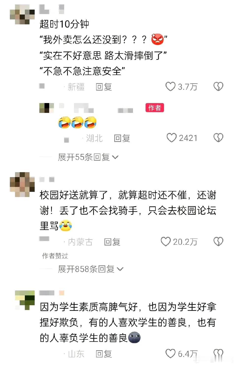 刷到有人吐槽外卖超时十分钟,直接给了差评,底下吵成一片。有人说“超时就是违约,该