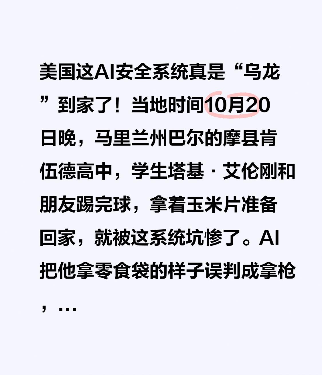 美国这AI安全系统真是“乌龙”到家了!当地时间10月20日晚,马里兰州巴尔的摩县肯伍德高中,学生塔基·艾伦刚和朋友踢完球,拿着玉米片准备回家,就被这系统坑惨了。 AI把他拿零食袋的样子误判成拿枪,一下子来了8辆警车,警察持枪让他跪下、上手铐。塔基第一反应是“我是不是要死了”。警方搜身才发现是零食袋。原来,巴尔的摩县去年就部署了这系统,有可疑就报警。塔基祖父很愤怒,学校表示遗憾。提供系统的公司致歉,却称误报难免。这AI误判,可把学生吓得不轻,也暴露了系统的不靠谱。