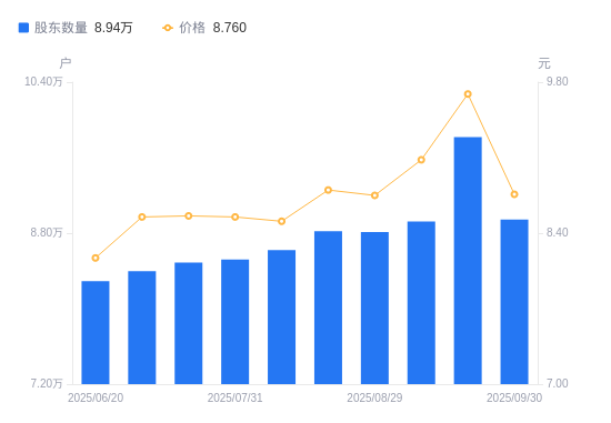 日期A股户数(户)流通A股户均持股数(股)户均持股市值(万元)2025-10-208644127250.1122.102025-09-308943426338.1623.072025-09-199818723990.2123.252025-09-108922426400.1523.972025-08-298813026727.8723.392025-08-208821926700.9123.502025-08-088619327328.5223.262025-07-318521327642.8223.632025-07-108487827751.9223.762025-06-308397728049.6723.98