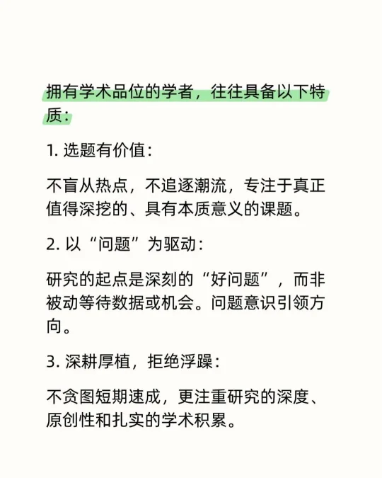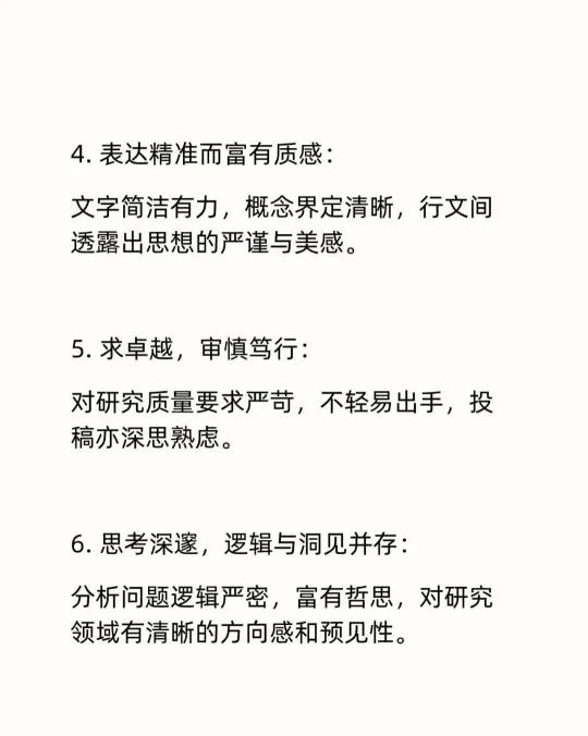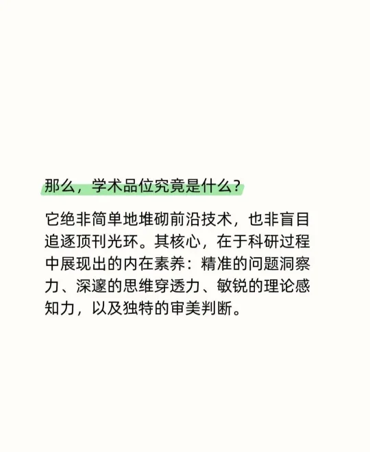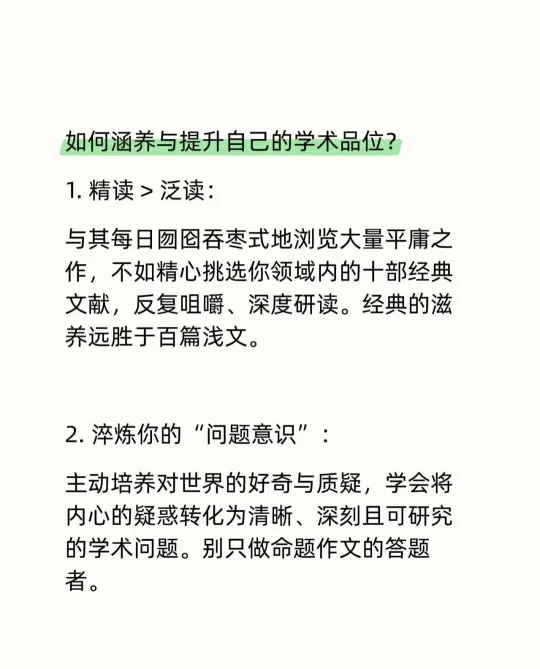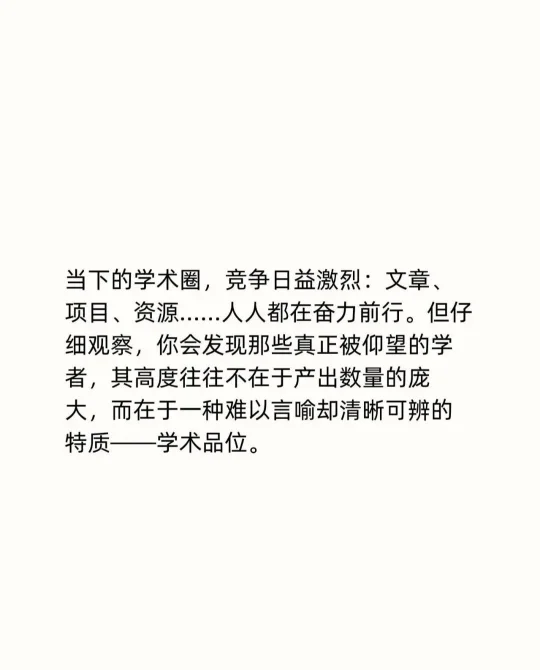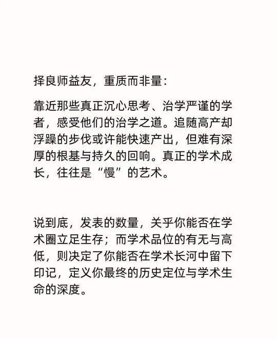 择良师益友,重质而非量: 靠近那些真正沉心思考、治学严谨的学者,感受他们的治学之道。追随高产却浮躁的步伐或许能快速产出,但难有深厚的根基与持久的回响。真正的学术成长,往往是“慢”的艺术。 说到底,发表的数量,关乎你能否在学术圈立足生存;而学术品位的有无与高低,则决定了你能否在学术长河中留下印记,定义你最终的历史定位与学术生命的深度。