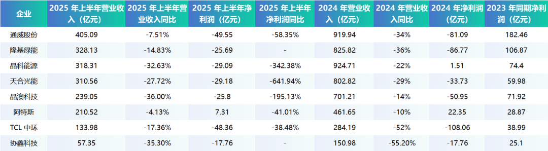 在三季报集中披露前夕,回看2024年至2025年中光伏龙头的经营轨迹,有助于更清晰地锚定行业当前所处的阶段。经营业绩是企业抵御行业周期的根本支撑,然而2024年以来,龙头企业普遍面临营收大幅下滑、盈利由盈转亏的困境;从2025年中报来看,这一颓势尚未出现明显扭转。