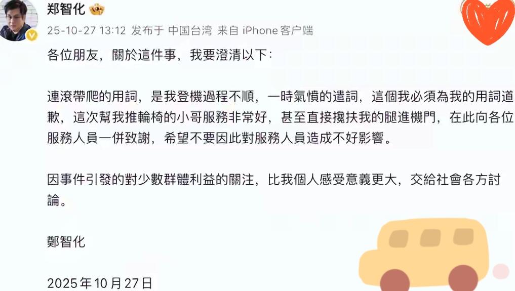 郑智化一句“连滚带爬”闹上热搜,现在致歉说气话,这波反转真没必要揪着字眼骂。 其实这事最该看的不是用词夸张与否,而是20厘米的高度差里藏着的真问题。机场说这是安全规范,郑智化吐槽不便,本质是服务规范和特殊需求没对上茬。 还好机场没纠结对错,直接加人加设备整改,这态度比互撕有用多了。郑智化最后说关注少数群体更重要,这话算说到点子上了。 毕竟明星发声能掀波澜,可普通残障人士遇着类似麻烦,连说理的地方都难找。真正该改进的,是不用等热搜就能顺畅出行的环境。