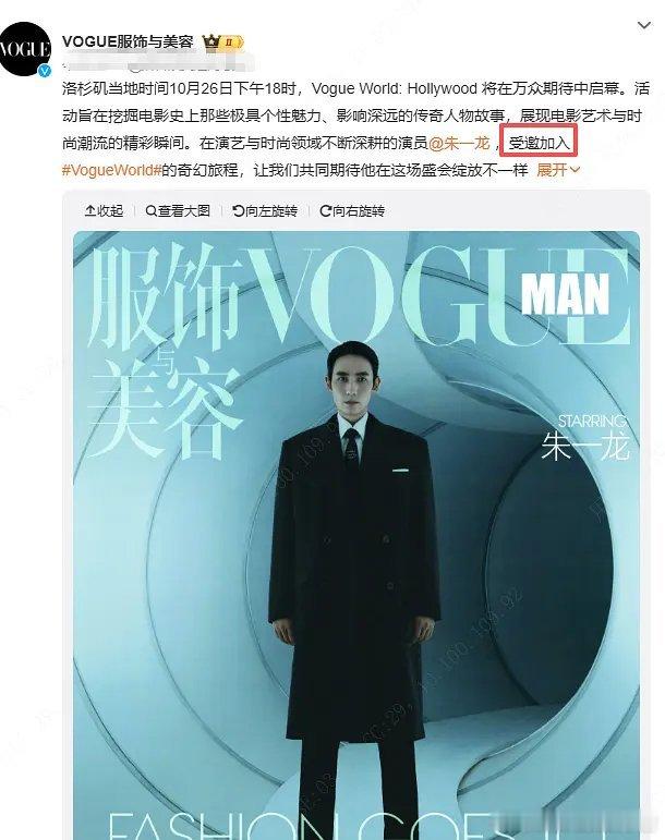 朱一龙VogueWorld看秀待遇🈶