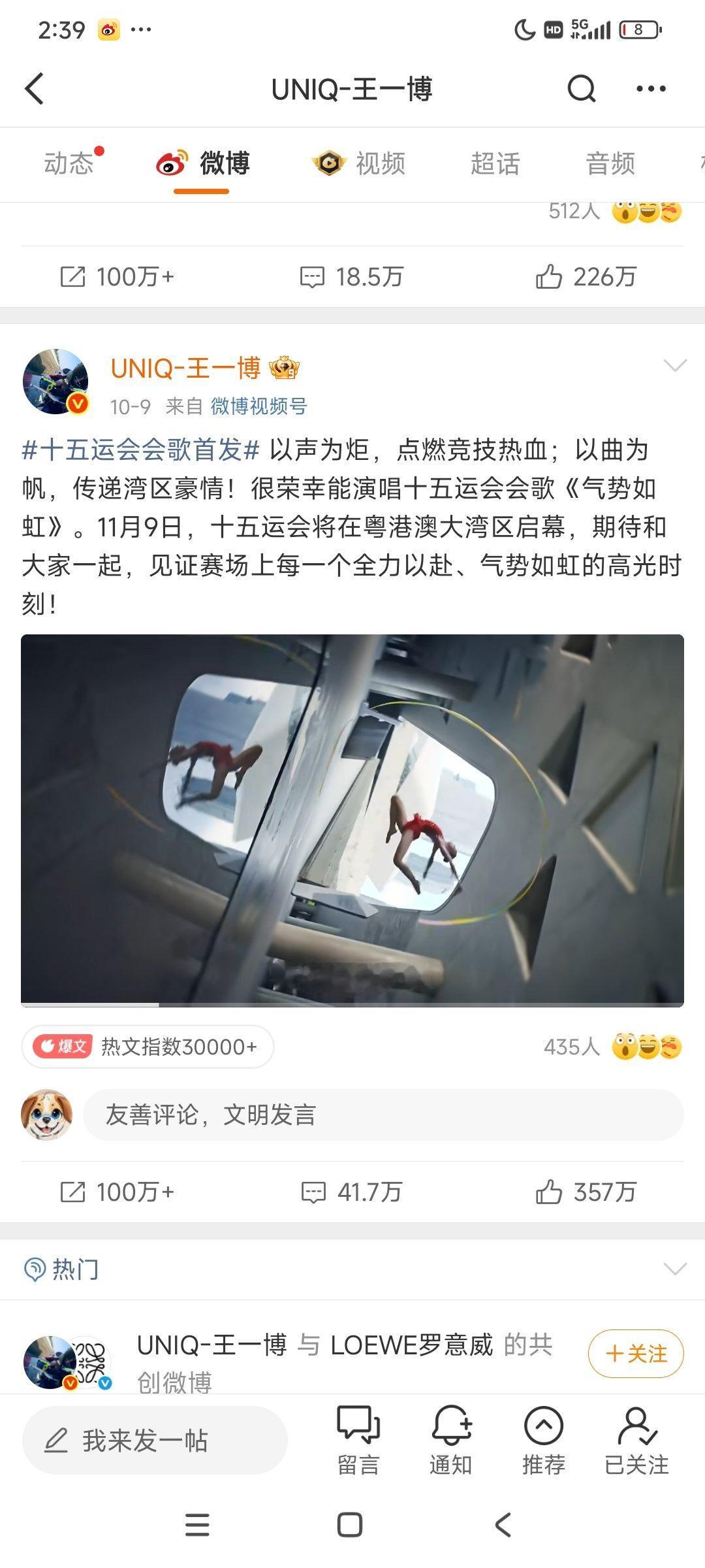 王一博演唱的全运会会歌《气势如虹》破亿拉!!!!!已经分不清这是博帝第几个wb破