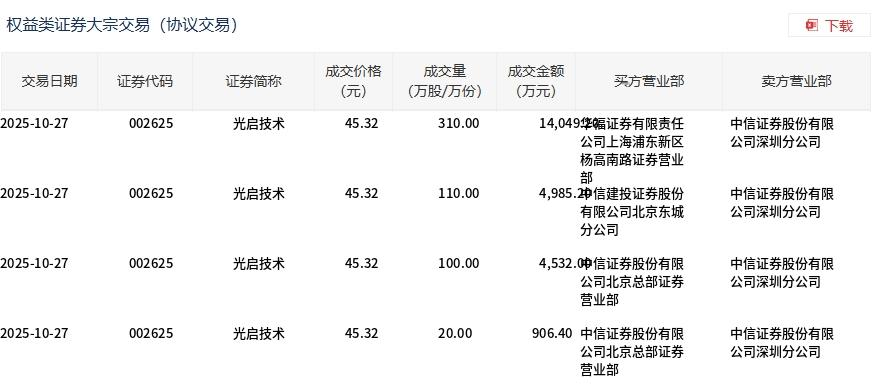 10月27日,光启技术大宗交易成交540万股,成交额2.45亿元,占当日总成交额的16.66%,成交价45.32元,较市场收盘价46.48元折价2.5%。