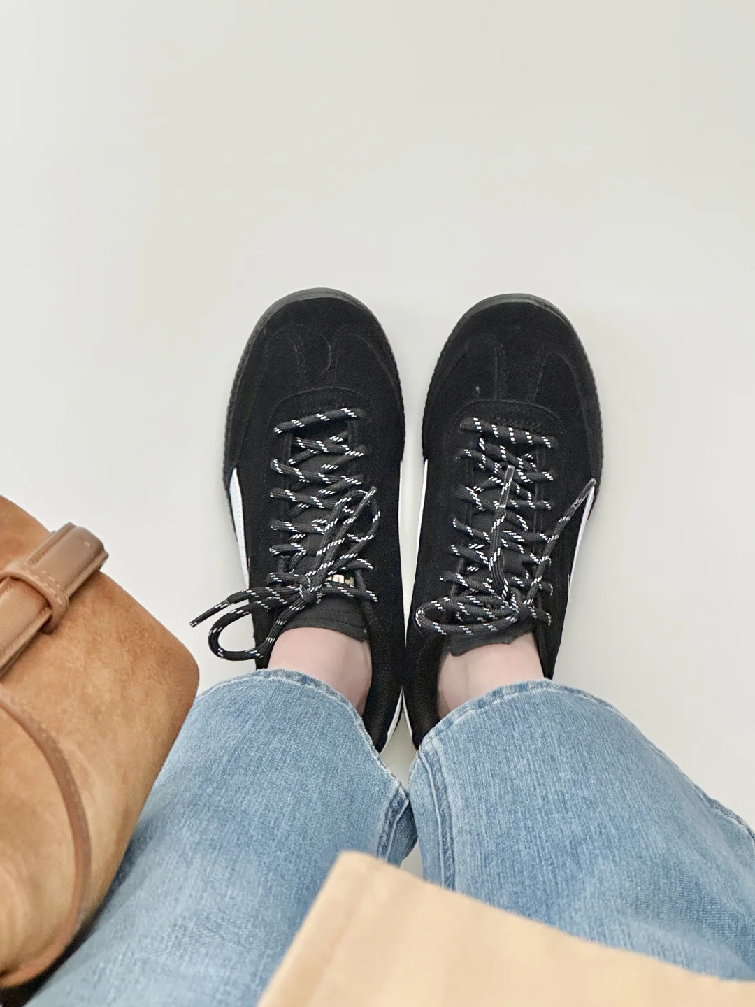 黑色的鞋身上有白色的线条,简简单单的,挺耐看