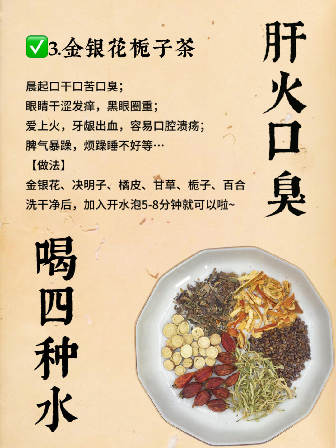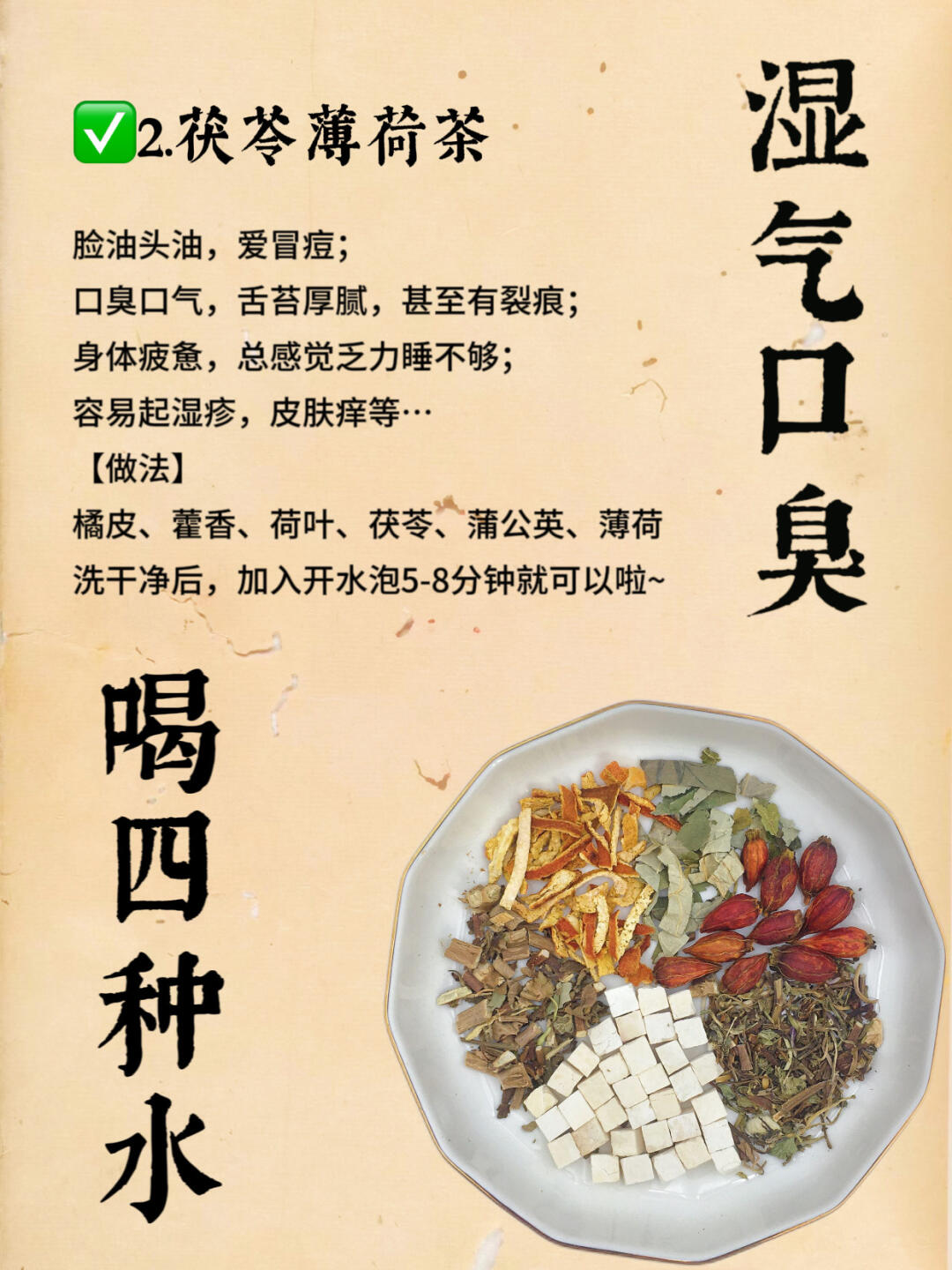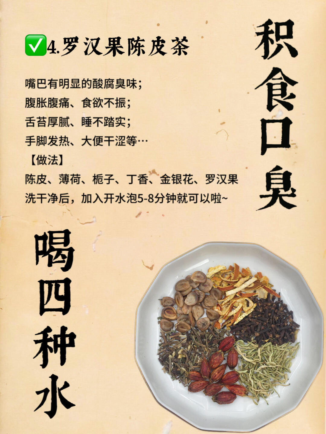 👆具体做法见上图哦👆 1⃣脾胃口臭——丁香陈皮茶 2⃣湿气口臭——茯苓薄荷茶 3⃣肝火口臭——金银花栀子茶 4⃣积食口臭——决明子大麦茶 (⚠️注意:每个人体质和口臭情况不同,茶方会有所调整哦) - 📍解·决口·臭是一个稍微漫长的过程,口臭的宝子们找到适合自己的方法后一定要坚持!希望大家都能早日口气清新呀~ -