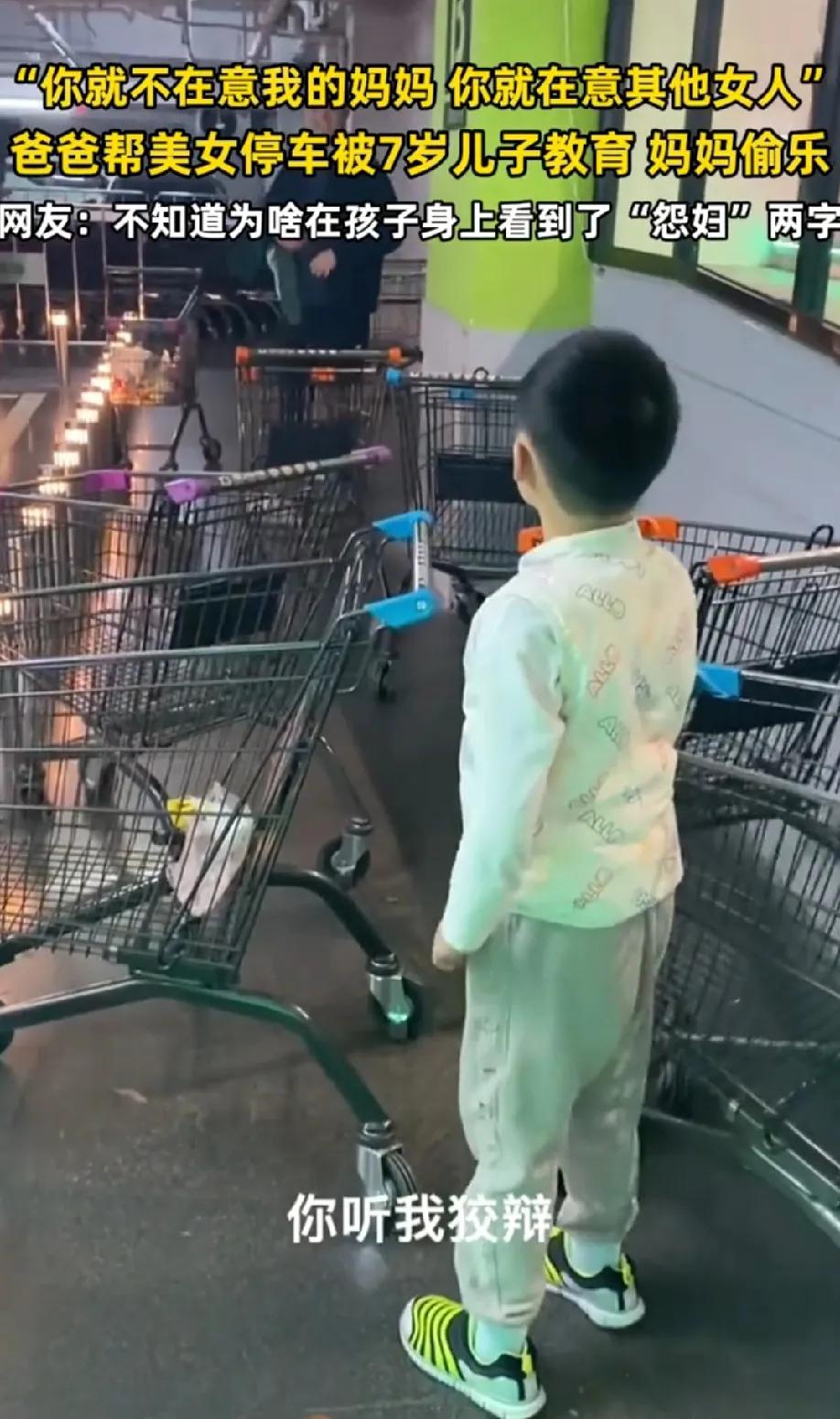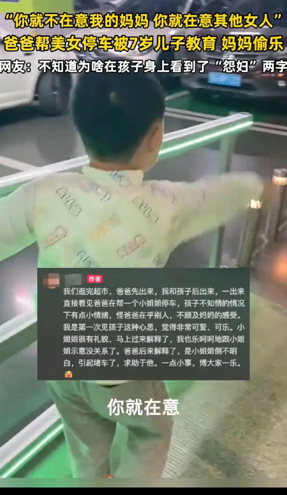 爸爸帮美女停车被7岁的儿子教育 “你就不在意我的妈妈,你就在意其他女人,就不在意你结婚的人”“你听我狡辩” 没想到爸爸下一句话直接认错了,知道狡辩没有用了。 幸亏美女停好车,很有礼貌地,赶紧过来向妈妈解释,才停止了儿子的追问,别说儿子不依不饶的追问真有“怨妇”的味道。 儿子长大了,懂事了,懂得保护妈妈了,这种被护着的感觉真好!难怪妈妈偷着乐,生了个报恩的人啊! 也提醒各位男同胞们,尤其是老婆在的时候,帮忙之前,尤其对方是异性。最好咨询一下老婆的意见,避免造成误会。