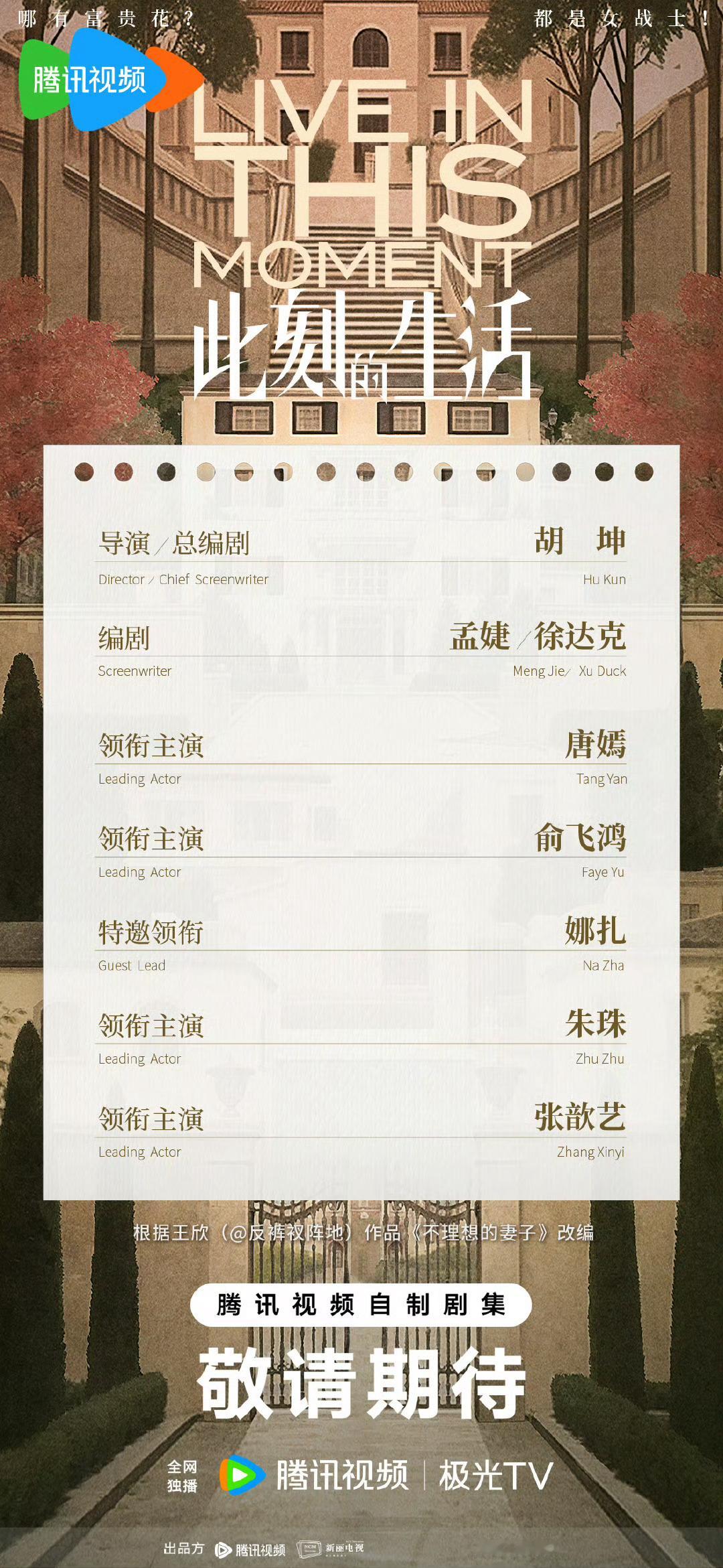 唐嫣又一部大女主剧《此刻的生活》,官宣主演全部为女性:唐嫣 俞飞鸿 娜扎 朱珠 张歆艺,好会挑人,感觉是个好饼!