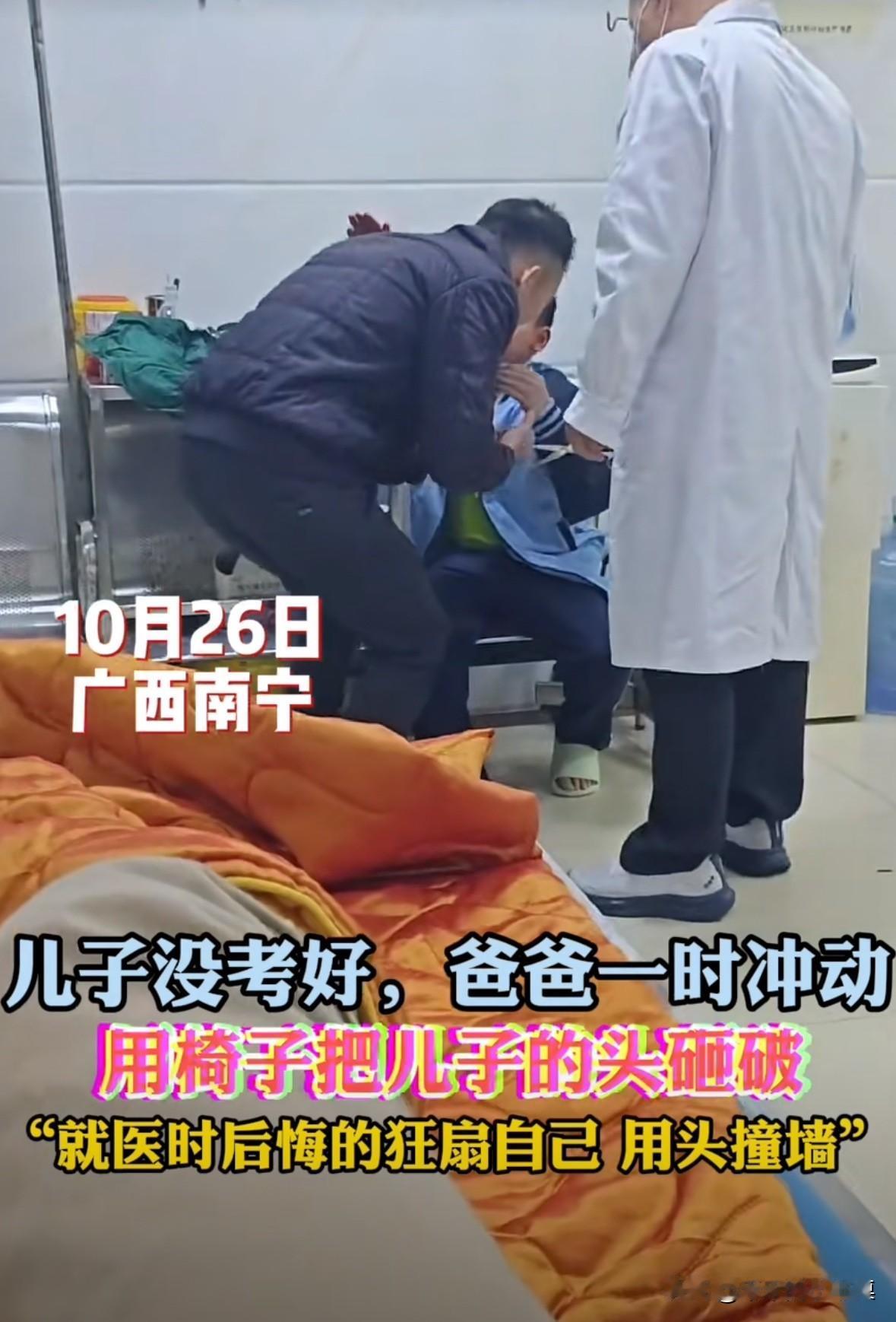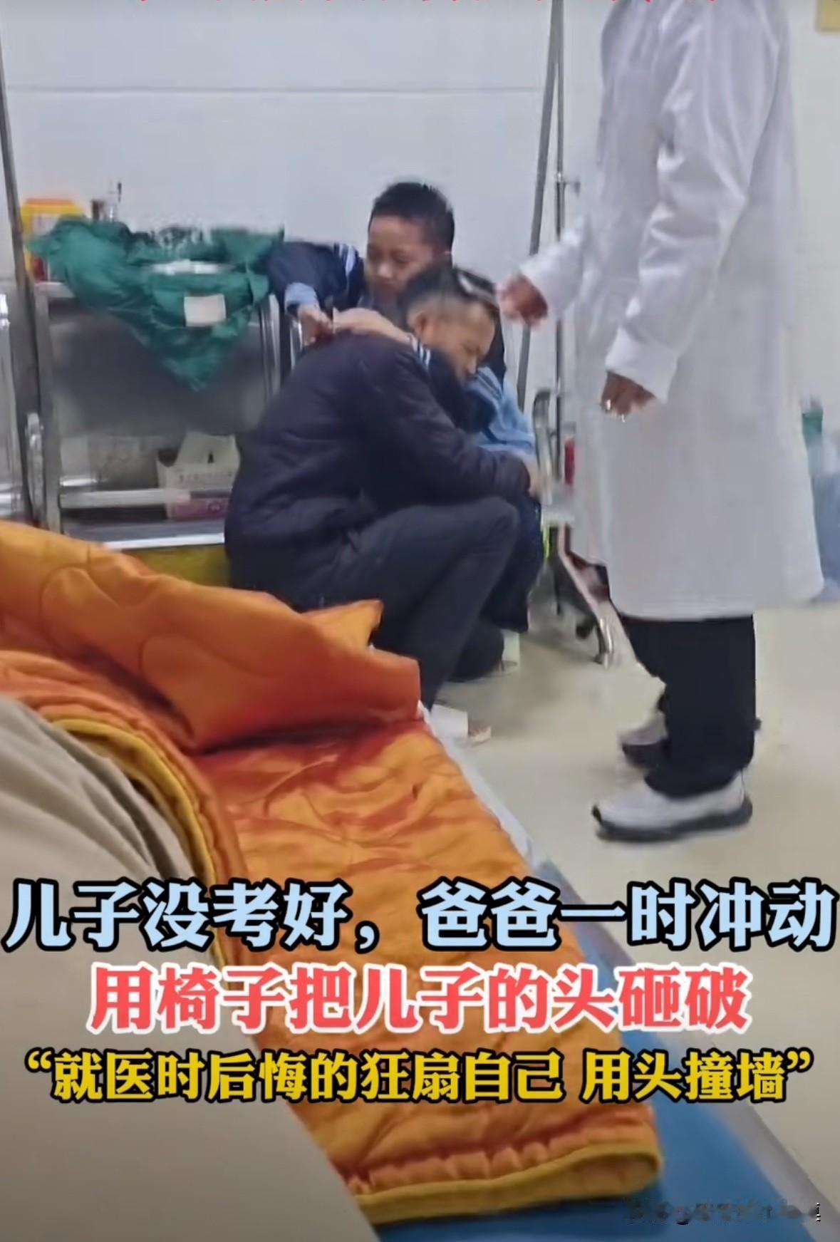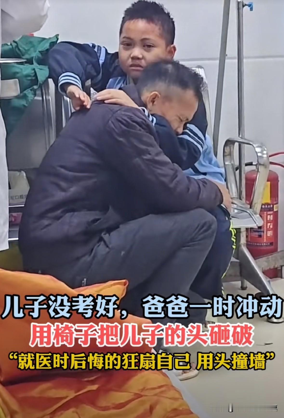 儿子考试没有考好,爸爸拿起椅子扔了过去,把儿子的头砸破了! 据了解,是单亲家庭,爸爸当天工作也不顺心,儿子考试只考了10分,爸爸一怒之下才用椅子砸了儿子,儿子也是脾气大,硬是没有躲开,头流了很多血。 爸爸带儿子去医院就医时,内心很愧疚,于是疯狂扇自己巴掌,还用自己的头撞墙。 儿子一直阻拦着爸爸,爸爸一直跟儿子道歉。 我理解爸爸,这种情况儿子就是爸爸全部的精神寄托,希望越大,当然失望越大。 但是换个思路想想,他考十分,你还打啥,他开心孝顺就行了。