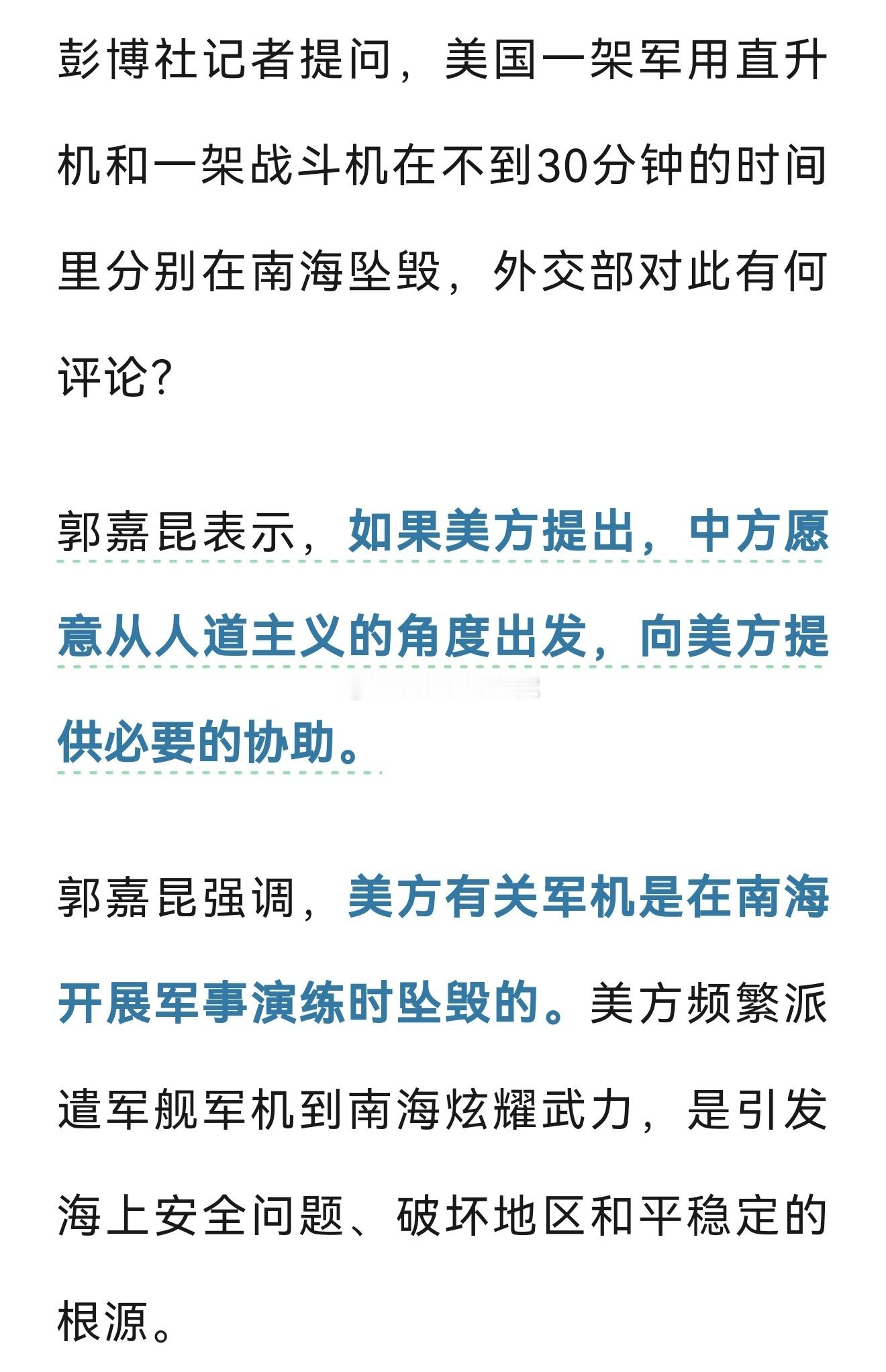 郭嘉昆表示,如果美方提出,中方愿意从人道主义的角度出发,向美方提供必要的协助。美方有关军机是在南海开展军事演练时坠毁的。美方频繁派遣军舰军机到南海炫耀武力,是引发海上安全问题、破坏地区和平稳定的根源。2架美军机在南海相继坠毁