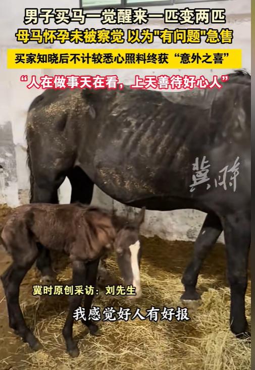 “好人有好报!”近日报道,山东淄博,一男子早晨去马厩喂马,突然听到一阵嘈杂声,走近一看却发现马厩里多了一匹小马驹,正在它妈妈身旁努力地站起来。想到这匹马因为“生病”被原来的主人抛弃,男子突然有点感动,称这种意外之喜来的猝不及防,不是金钱能衡量的。   “老刘,你这买的可不是一匹马,是两张嘴啊!”望着马厩里突然多出的小生命,邻居的一句玩笑话,却道出了一场最温暖的奇迹。   那天早上,刘先生像往常一样走向马厩,却发现刚接回家没多久的母马身旁,竟依偎着一个湿漉漉的小家伙。小马驹颤巍巍地蹬着细腿,一次又一次尝试站立,而它的母亲,而那匹被前主人认定“肺部有病”的母马,正温柔地舔舐着自己的孩子。   就在几天前,这匹母马还是个“麻烦”。前主人认定它肺部有问题,跑几步就喘,急着脱手。刘先生去看马时,却与这匹马对上了眼,它温顺的眸子里,有种说不出的灵性。所以,在明知可能买回个“药罐子”地情况下,他还是毫不犹豫地付了钱。   “当时就觉得,这马跟我有缘。”刘先生后来回忆,“它看我的眼神,就像在说什么话。”   现在回想起来,一切都有了解释。母马那看似病态的喘息,那略显笨重的身躯,是因为它怀孕了。正是前主人的误判,才阴差阳错地让这对母子找到了真正的归宿。   慢慢地,小马驹终于站稳了,尽管细长的腿还有些打颤,但它倔强地昂起了头。这个初来世界的生命不会知道,自己的到来如何照亮了一个普通人的早晨。刘先生站在一旁,看得眼眶有些发热。   “那种感觉,真的不是用钱能衡量的。”他反复说着这句话。在这个一切明码标价的时代,生命最原始的感动,总能在某个不经意的瞬间,击中我们内心最柔软的部分。   视频传到网上,瞬间温暖了无数人的心。有网友妙评:“这是史上最成功的‘捡漏’,不仅买一送一,送的还是个无价之宝。”更让人感动的是刘先生后来说的:“我当时觉得,既然都买了,就接受它有问题,没想到会是这样,现在觉得它们来到我这里,就是最好的安排。”   据兽医所释说,母马怀孕后期确实会出现呼吸急促、运动能力下降的情况,这与肺部疾病的症状极为相似。   最后,这个发生在淄博的真实故事,虽然没有惊天动地的情节,却有着最抚凡人心的温度。一匹被误判的“病马”,一个凭眼缘做出的决定,最终演绎成生命赠予的最美礼物。只能说,生命会找到自己的出路,而善意,终将得到最美的回响。   信源: 冀时——男子买马一觉醒来一匹变两匹,母马怀孕未被察觉 以为“有问题”急售,买家知晓后不计较悉心照料终获“意外之喜”“人在做事天在看,上天善待好心人”   文│一阳 编辑│史叔