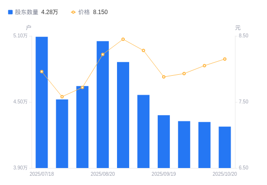 近一年(2024年12月31日至2025年10月20日),九鼎新材A股股东户数从3.57万户,增加至4.28万户,增幅19.75%,区间股价上涨54.18%。