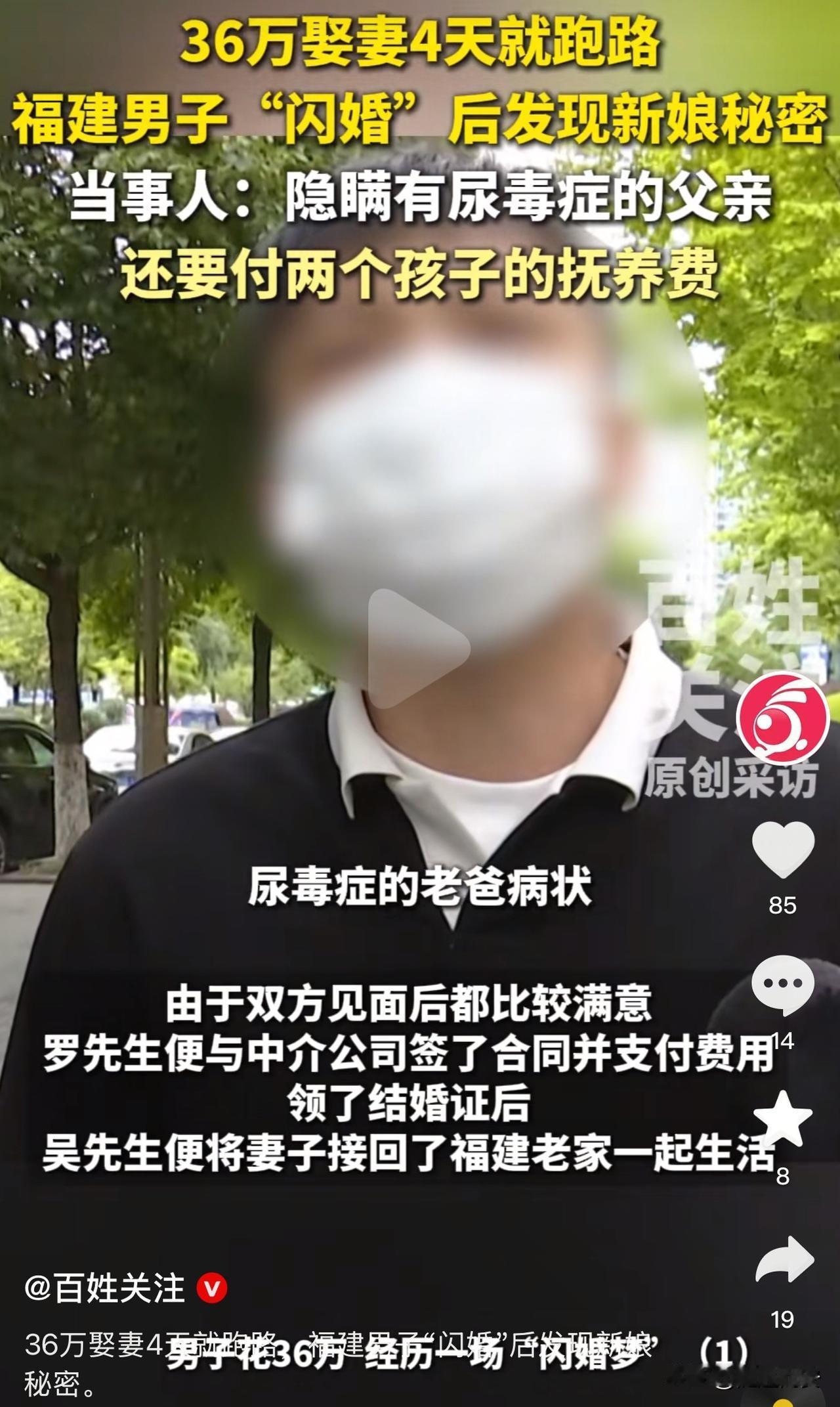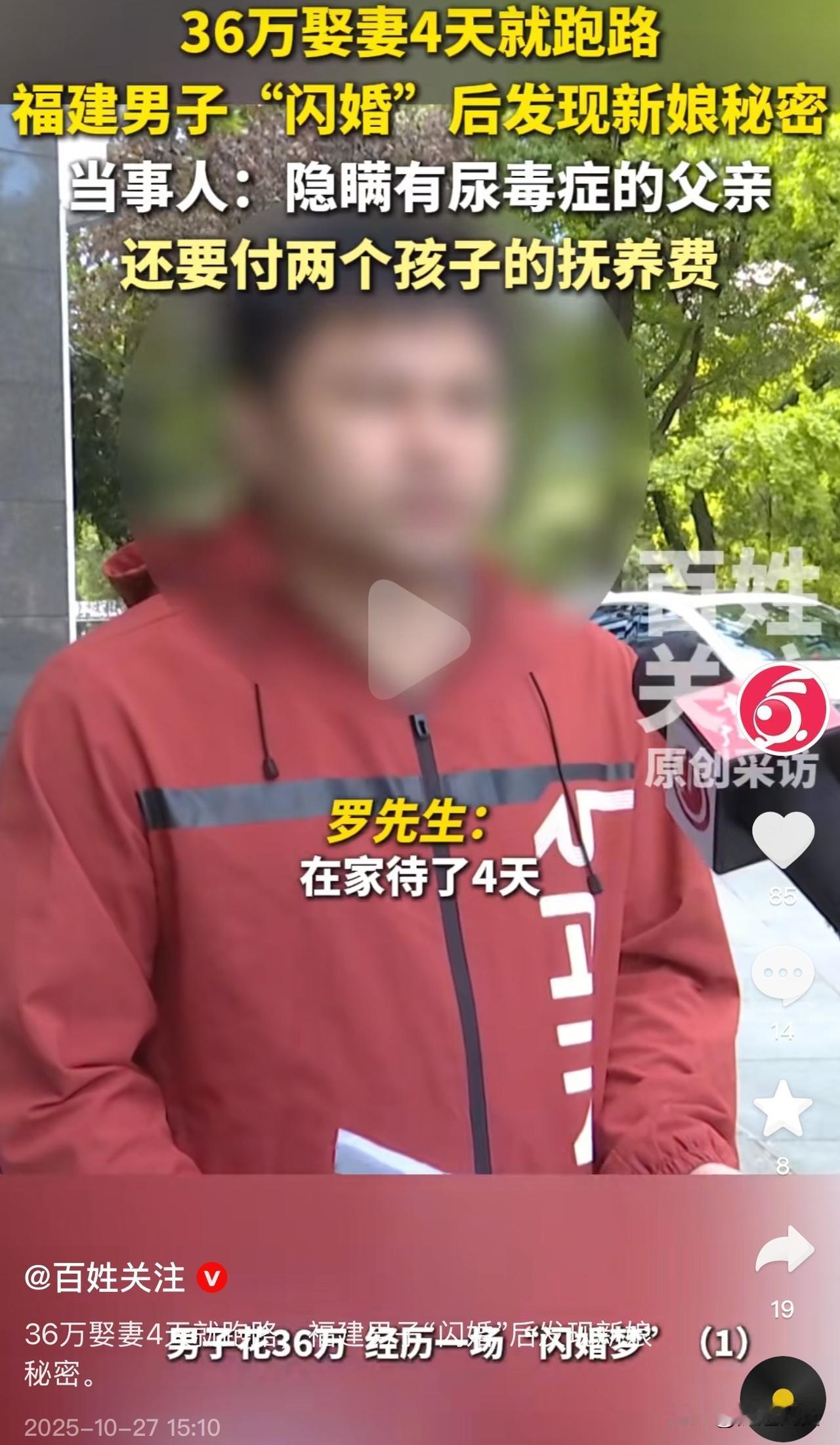 太离谱了!福建一男子花36万娶妻,没想到只共同生活了4天,女方就跑路了,男子到女方老家了解情况,不料却遭到了女方家人的人身威胁。 该男子通过贵州的婚介公司认识了云南的女子,两人见面后互相了解了一番,都觉得彼此还不错,两三天后就领了结婚证。 该男子支付完婚介费、女方的彩礼等费用后,带着女方回福建生活,他以为自己过上了婚后的幸福生活,但让她没想到的是,刚结婚没几天,新娘就离开了。 该男子称,回家的当天新娘貌似就对他家不满意,他的父母兴高采烈的去迎接他们,帮新娘拿行李,她都不愿意。 虽然女方对他家种种挑剔,但是他们还是热情的接待了她。 一起生活后,男子了解到妻子隐瞒了一些秘密,这让他们家里炸开了锅。 妻子的父亲身患尿毒症,医疗费需要他们支付;更离谱的是,女方和前夫所生的孩子的抚养费,也得需要该男子支付,每个月2000元。 该男子表示自己一个月只挣三四千块钱,无力承担这么多费用,他妻子听后以“出门打工挣钱”为借口就走了。 刚开始两个人还有联系,后来就再也联系不上。妻子就像人间蒸发了一样,消失的无影无踪。 无奈之下,该男子找到其中一家婚介公司的负责人,两人一起来到妻子的云南老家了解情况。 当天他们没见到她家人,通过村民嘴里了解到一些其它情况。 原来,他岳父不仅身患重病,还是一个老赖,整个村对他们避而远之。 就在第二天,他们准备再次上门,结果却遭到了对方的生命威胁,称: “只要还敢过去,就拿命跟我拼,反正尿毒症我不怕死。” 就这样,该男子打消了去她家了解情况的念头。 针对这个情况,参与促和他俩的两家婚介公司,均把婚介费返还了男子,共计13万元。 目前,男子表示会通过法律途径要回12.8万的彩礼。 这哪是结婚,简直是下了个连环套,几天骗走半辈子积蓄。 说到底,是有人把婚姻当成了快速敛财的生意。再次提醒我们,结婚过日子不是赶工期,一定要多了解对方的情况,有时间多跑几趟对方的老家,也多让别人把把关,别让着急蒙蔽双眼,掉进别人设置好的大坑。