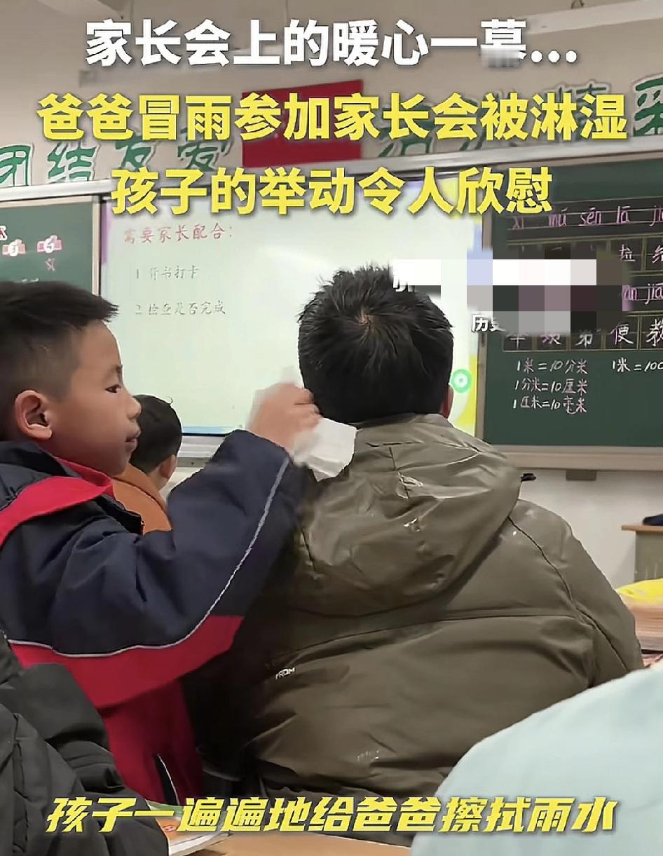 一位爸爸冒雨参加家长会,孩子看到之后,赶紧用纸巾帮忙擦掉爸爸衣服身上的雨水。就是这么简单温馨的一幕,感动了所有的网友。我想此刻爸爸的心情是非常欣慰的,在他眼里成绩已经没那么重要了。成绩优秀与否那只是一个分数,但人品的好坏将引导着人的一生。多少家长在焦虑孩子成绩的同时已经忽略掉了孩子做人的道理。