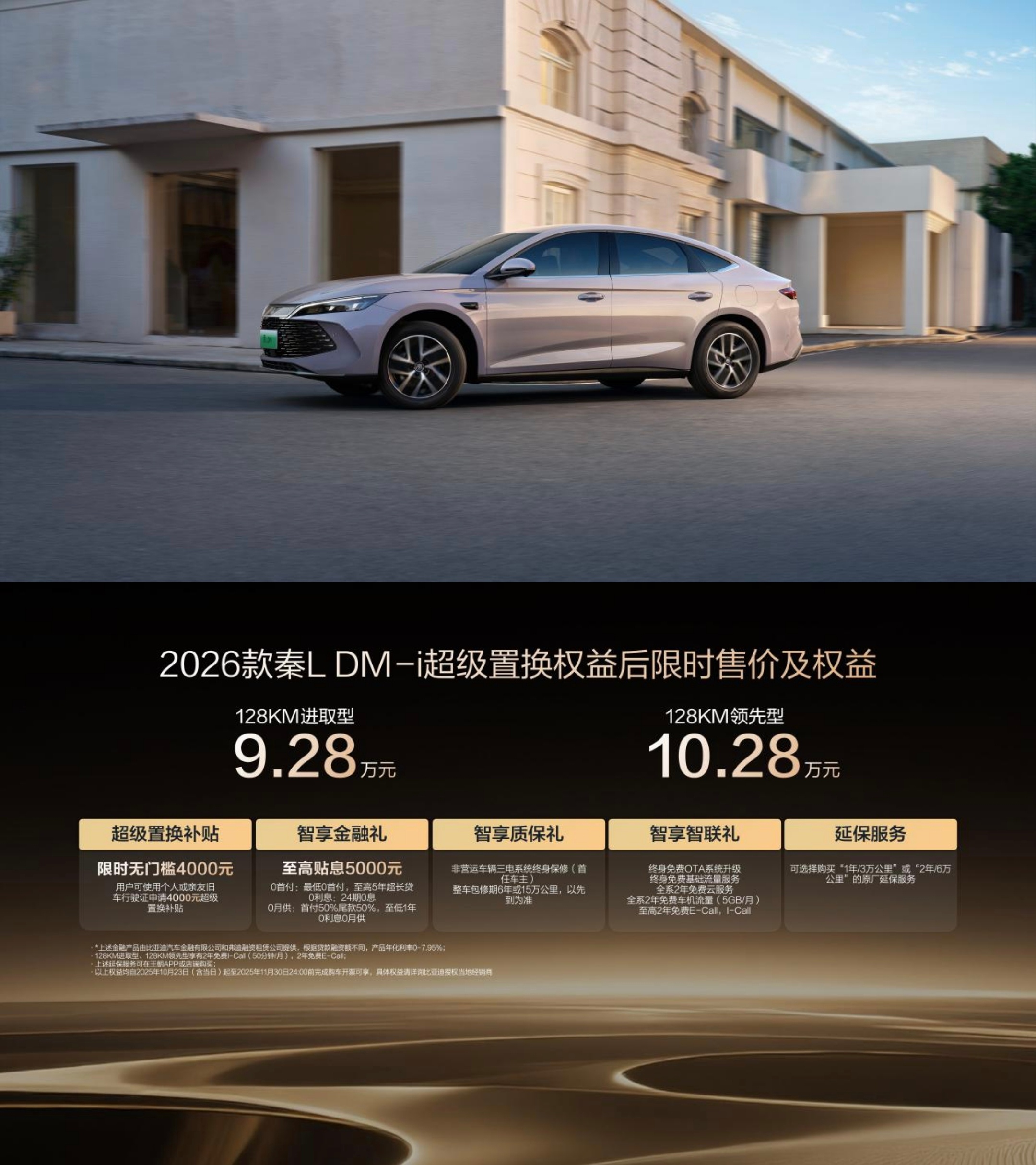 而秦L DM-i也没闲着,纯电续航 128km,油耗低至2.79L,怀挡设计+智能座舱,实用又好玩,限时9.28万起。