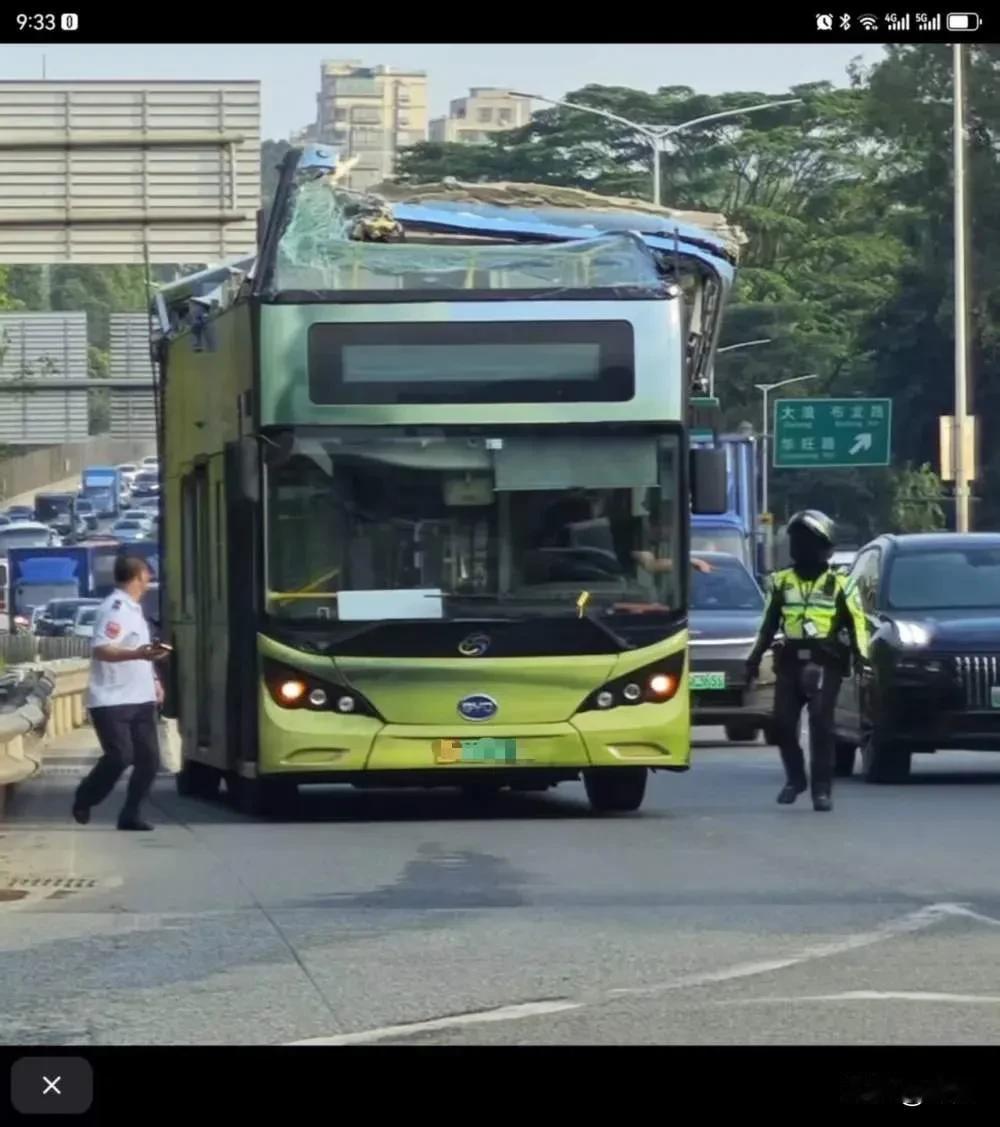 深圳一双层大巴被高架桥挤压成1层,现场血迹斑斑。事发10月26日,在广东省深圳市龙华区一座跨线高架桥下,一辆双层巴士通过桥下时,顶部被高架桥挤压变形完全塌陷,有人员受伤。 现场群众说,车上有血,疑似有人员受伤。第二层车窗玻璃碎片散落一地,周围有不少人站在路边围观。警方和消防、救护人员到场处理,事故原因和伤亡情况还在进一步确认中。 深圳一双层巴士被高架桥削顶