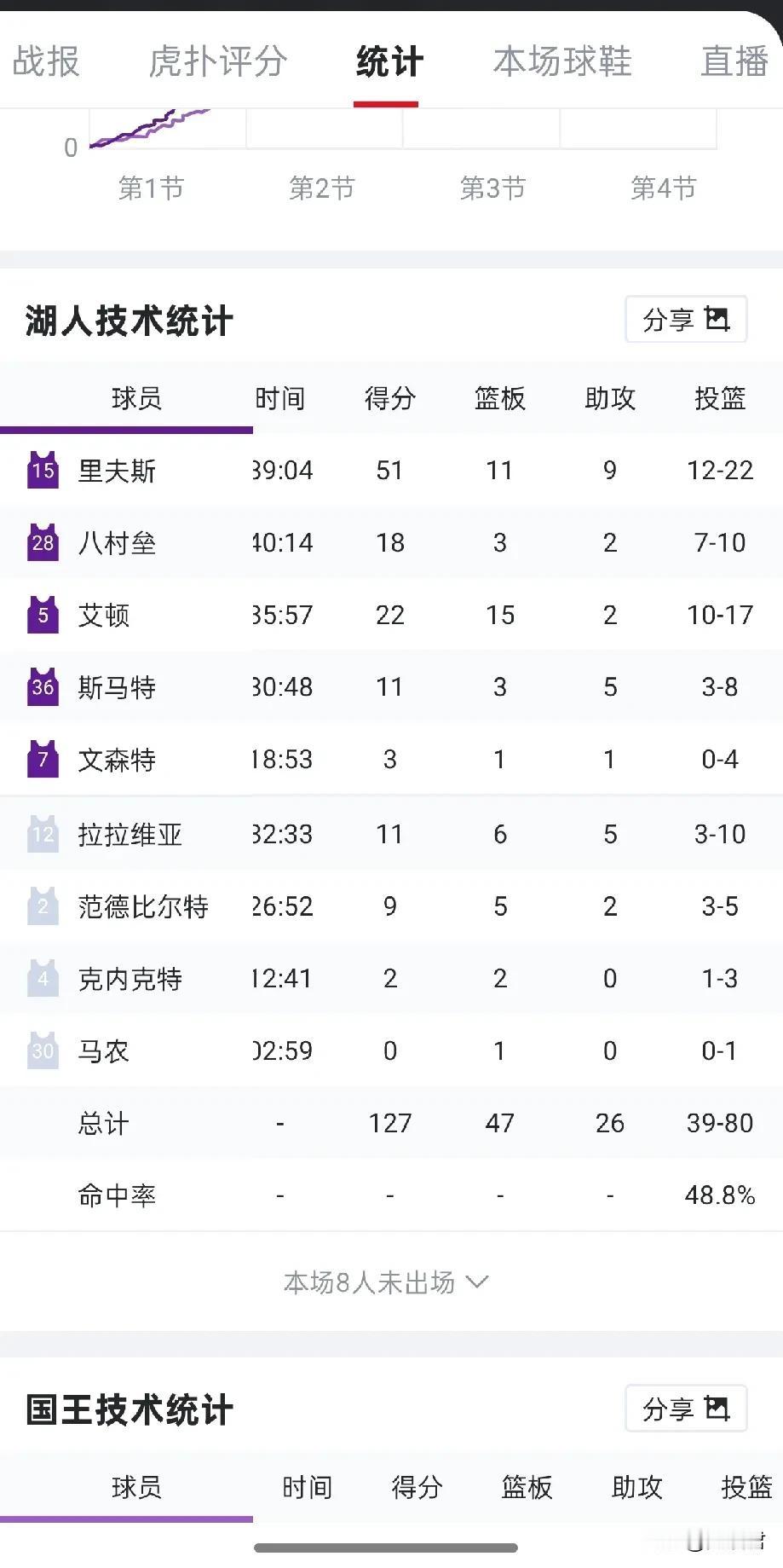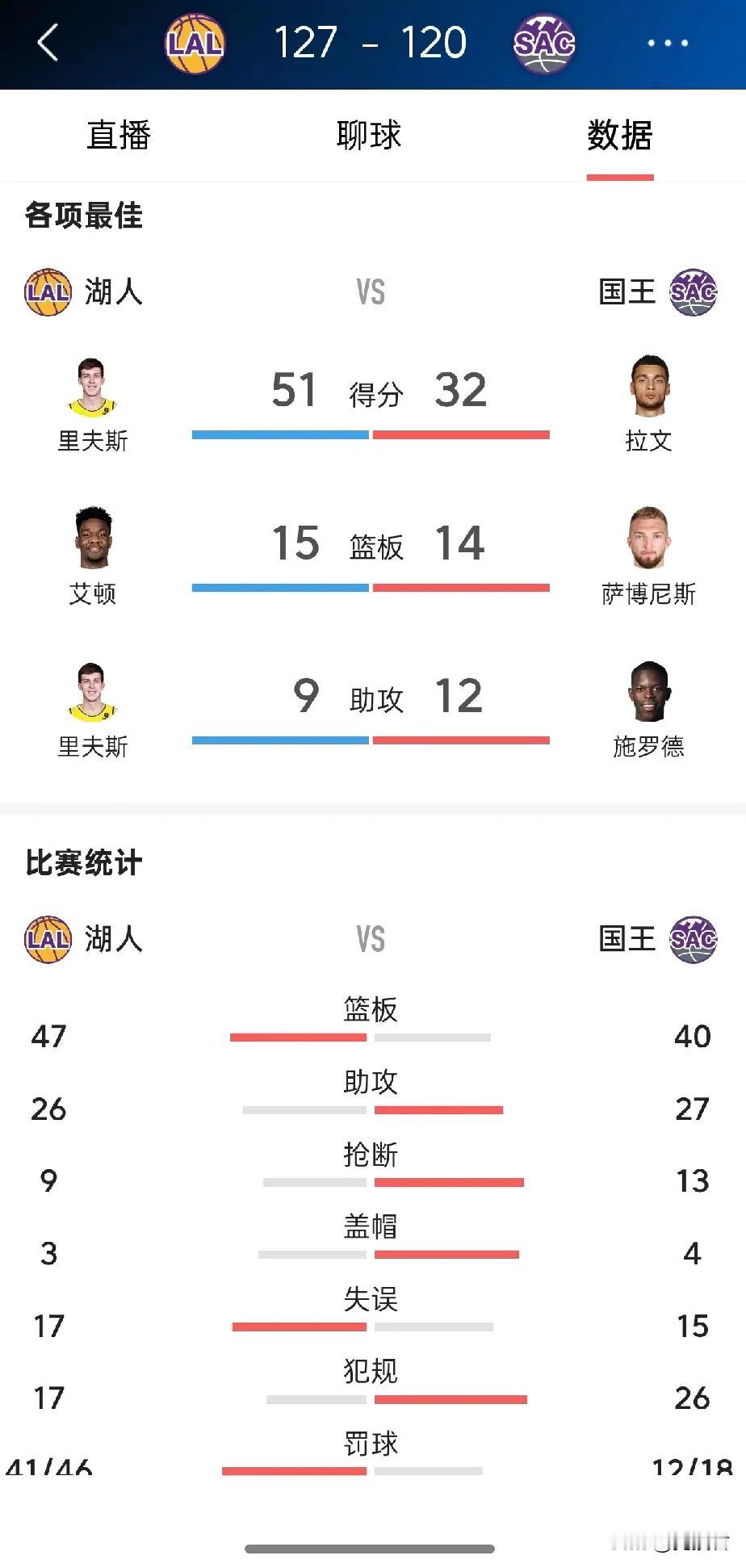 极为难看,在湖人战胜国王的比赛里,湖人罚球数量整整比国王多出28个,且是在詹姆斯和东契奇缺阵的情况下拿下这场比赛。 整场比赛,湖人赢得甚是丑陋。里弗斯投中12个球却砍下51分,只要哨子偏袒到位,人人都能成“MVP亚历山大”! 巴特勒3场合计34次罚球,砍下66分,罚球得分占比51.52%;里夫斯3场37次罚球,拿到102分,罚球得分占比36.27%。湖人自研出了“罚特勒”,不过其“爆罚力”也就只有勇士正版的70%左右,还得继续努力。 难道在这个年代,只有靠罚篮才能赢球吗?