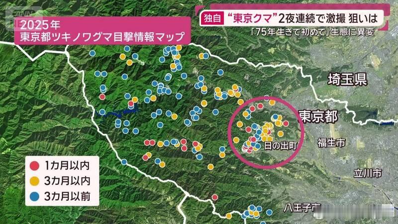 综合多家日本媒体报道,东京都西部多摩地区在8月底首次传出熊踪。一名50多岁的男子在奥多摩町河边钓鱼时遭幼熊袭击受伤,当地猎友会随后加强了巡逻防范。而近期距离东京更近的日之出町,又有居民拍到一头体长约1.5米的成年亚洲黑熊,半夜闯入民宅后院,爬上柿子树啃食果实。
