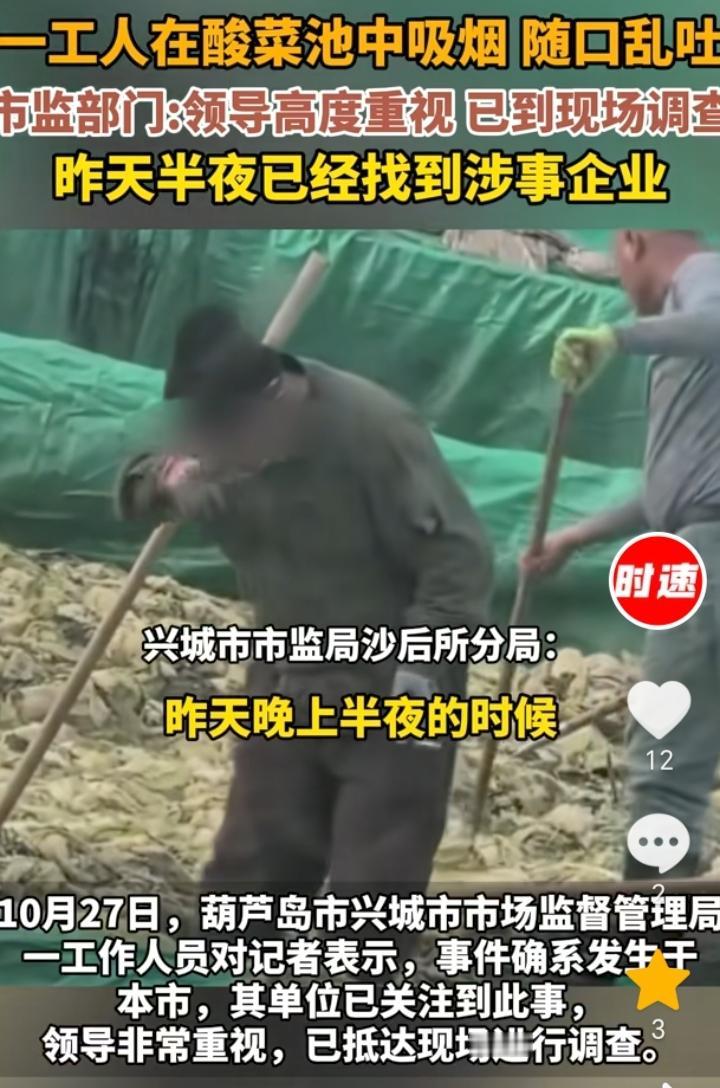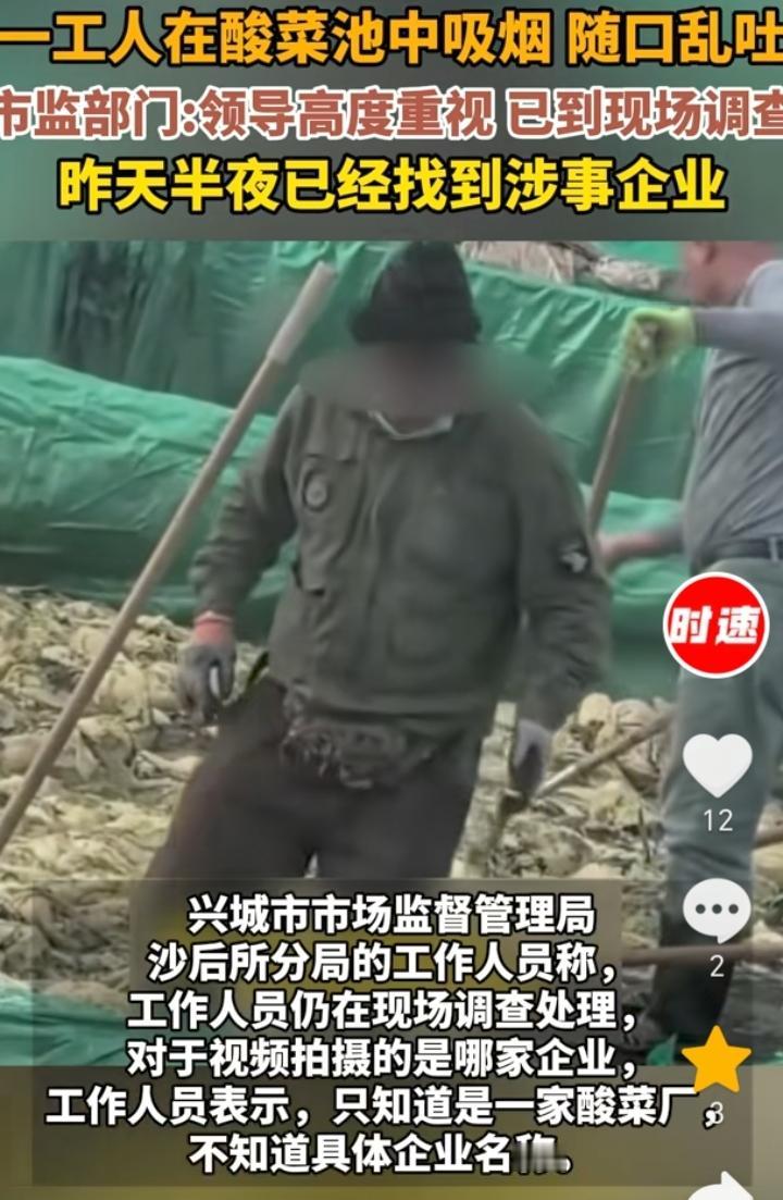太恶心了!辽宁葫芦岛,一酸菜厂工人站在酸菜池工作时吸烟吐痰,被网友拍摄了下来。 据时速新闻报道,近日有网友发视频显示,在辽宁葫芦岛有一家酸菜企业,工人戴着口罩站在酸菜池工作时,他把口罩拉低嘴露了出来,他不仅全程抽烟而且还在酸菜池中随口吐痰。有关部门称,已经找到了该酸菜厂,目前正在核查。 看完视频后,大家应该都会觉得太恶心了,以后都不敢再买酸菜吃了,俗话说“眼不见为净”,现在既然已经看到了,那就很难在接受了。 酸菜厂管理也是太过松懈,工人都可以全程抽烟还随口吐痰,这样制作的酸菜不仅卫生过不了关,而且质量也是令人堪忧。 希望有关部门能及时制止这批酸菜流入市场,并对该企业进行检查处罚。