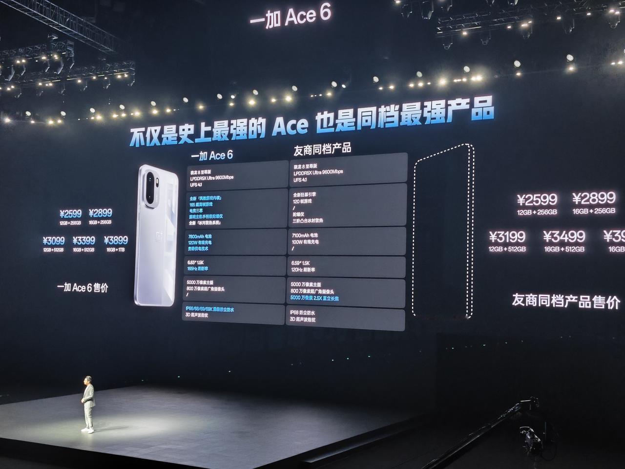 一加Ace6同样支持165Hz超高帧率,搭载骁龙8至尊版处理器,7800mAh电池,120W超级闪充。超声波指纹,金属中框。5000万像素主摄,800万像素超广角。12+256GB,2599;16+256GB,2899;12+512GB,3099;16+512GB,3399;16+1TB,3899。大家觉得怎么样?