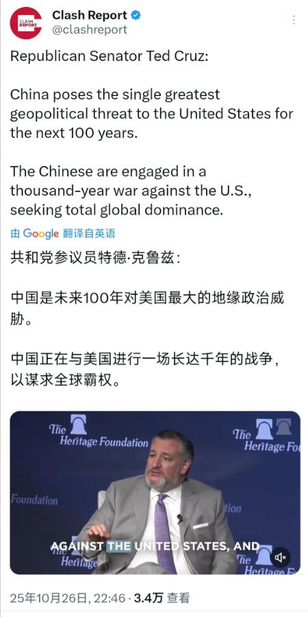 美国共和党籍参议员特德·克鲁兹(北京时间10月26日晚)表示:“中国是未来100年对美国最大的地缘政治威胁。中国正在与美国进行一场长达千年的战争,以谋求全球霸权。”   先不说美国从建国到现在满打满算也才两百多年,连 “千年” 到底是个什么概念都没经历过,单说他嘴里 “中国要谋求全球霸权”“给美国搞地缘威胁” 那套话,跟现实里的事儿根本对不上号。   就说他提的 “地缘政治威胁” 吧,更像是把美国自己的做法硬安到中国头上。   2023 年 3 月有件事儿在国际上炸开了锅 —— 沙特和伊朗这两个断交七年的中东老对手,居然在北京坐下来握手言和,还明明白白说要在两个月里重新把各自的使馆开起来。   要知道这俩国家之前可是斗得厉害,好几次都快闹到打仗的份上了,美国在中东折腾了几十年,想让这俩和解压根没办成,结果中国凭着不偏不向的立场,实实在在帮着牵线,最后真把事儿办成了。   中国跟沙特、伊朗都没什么历史积怨,也不搞 “拉一派打一派” 的小聪明,就是真心实意推动和平,这跟 “霸权” 沾半毛钱关系吗?   再看美国,这些年在中东一直琢磨着搞 “反伊朗联盟”,靠挑着两国对立来维持自己的影响力,后来美媒自己都有点酸地说,这事儿算是中国在外交上的一次大胜利。   再聊聊他说的 “千年战争” 这个比喻,简直离谱到家了。真要较起真来,现在满世界搞 “战争那套逻辑” 的,反倒是美国自己。   现在全球范围内,美国的军事基地掰着指头数都有 800 多个,从印太地区的四方安全对话,到跟澳大利亚、英国搞的 AUKUS 三边联盟,再到动不动就在南海搞军演,全是把地缘格局往军事化的方向推。   可中国这些年干的事儿呢?2024 年的时候,中美之间的货物贸易额就到了 6882.8 亿美元,服务贸易额也有 668.6 亿美元。   更别说美国对中国出口的那些农产品、集成电路,跟 2001 年比起来,增长了 648.4%,这个增速比美国对全球其他地方的出口增速快多了。   之前深圳盐田港因为中美关税调整,还出现过 “一船难求” 的情况,企业都抢着把货装船发走,这哪像是要 “打仗” 的样子?明明是两边谁也离不开谁的合作关系。   克鲁兹说中国 “谋求全球霸权”,可谁都知道,霸权这东西,从来不是靠帮人修铁路、搞合作能得来的。   中国搞 “一带一路”、办亚投行,说到底都是帮着其他国家建基础设施、打通经贸通道。   就像中老铁路,通车之后直接让老挝从原来的 “陆锁国”(就是被陆地围着没出海口)变成了 “陆联国”,货物能更方便地运进运出,当地老百姓也跟着受益。   这种项目里,从来没提过要搞 “军事控制”,也没说要推什么 “意识形态扩张”,全是实打实的互利。   反观美国,这些年退了不少国际组织和协议,从《巴黎气候协定》到伊朗核问题全面协议,只要不是自己说了算的机制,就不想掺和,想怎么来就怎么来,这才是霸权该有的那种霸道劲儿。   更别说中国还是联合国安理会常任理事国里,派维和人员最多的国家,这些年一直在世界各地帮着维护安全,跟 “威胁” 两个字比起来,完全是反着来的。   其实克鲁兹说这套话,说到底是为了迎合美国国内的政治需求。现在美国的媒体环境越来越碎片化,那些极端的、吸引眼球的言论反而更容易被关注。   再加上冷战那套思维一直没断根,有些人总想着找个 “对手” 来炒作,把中国当成新目标,既能调动选民的情绪,还能把国内的一些问题(比如经济增速放缓、社会分歧)盖过去。   可这种靠编个 “敌人” 来搞政治动员的办法,根本站不住脚。2024 年中美搞经贸会谈之后,两边调整了部分关税,市场需求立马就起来了,企业忙着发货,港口也热闹起来,这就说明互利共赢才是主流。   克鲁兹说的那套 “千年战争” 的事儿,别说中国不认可,连美国的企业都不买账 —— 毕竟企业要的是订单,不是什么 “战争叙事”。 中国从来就没打算跟谁打什么 “千年战争”。   往远了说,当年郑和下西洋,带的是丝绸、瓷器,是去跟其他国家做买卖、交朋友,不是什么坚船利炮;   往近了说,现在促成沙伊复交、推进跟其他国家的经贸合作,靠的也是诚意和实在办事儿,没搞过半点虚的。   美国要是真担心地缘安全,与其听克鲁兹喊口号,不如少搞点军事联盟、少挑点对立,多参与点像中美气候合作那样的实在项目 —— 毕竟气候问题、疫情防控这些事儿,靠对抗解决不了,只能靠合作。   事实就摆在那儿:那些满世界搞对立、挑冲突、动不动就亮拳头的,才是真的威胁;   而中国这些年一直是和平的建设者、合作的推动者,帮着建铁路、促和解、护安全,这些事儿不是靠几句夸张的话就能给颠倒过来的。克鲁兹的说法听着热闹,可跟现实一对照,就显得格外站不住脚。