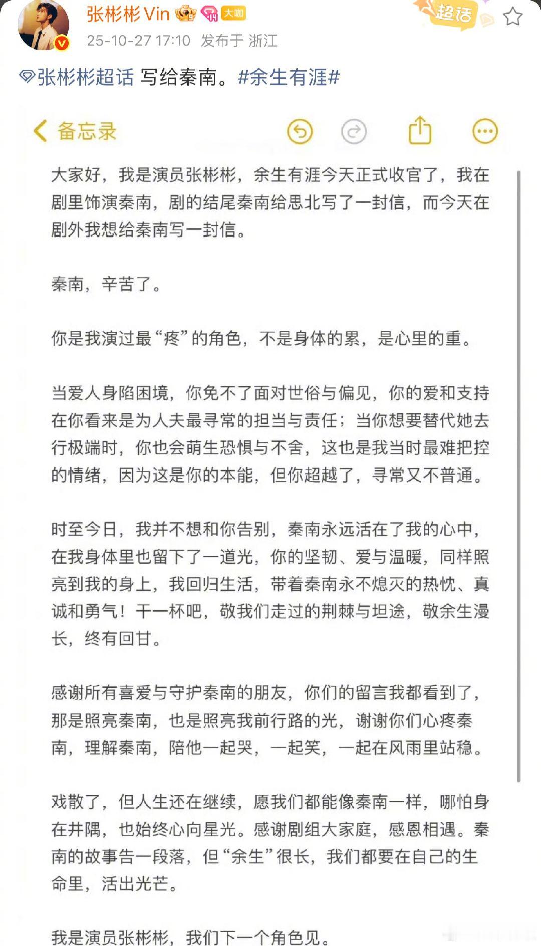 张彬彬发文告别秦南 《余生有涯》今日正式收官,发布走心收官长文,他坦言秦南这个角色给自己留下了一道光。这篇长文更像是他对秦南的一封信,感谢秦南这个角色让他经历了这段旅程,让我们看到了一位演员对作品的敬畏与热爱。这份真诚的告别,让人更加期待他未来的每一个角色。 ​​​