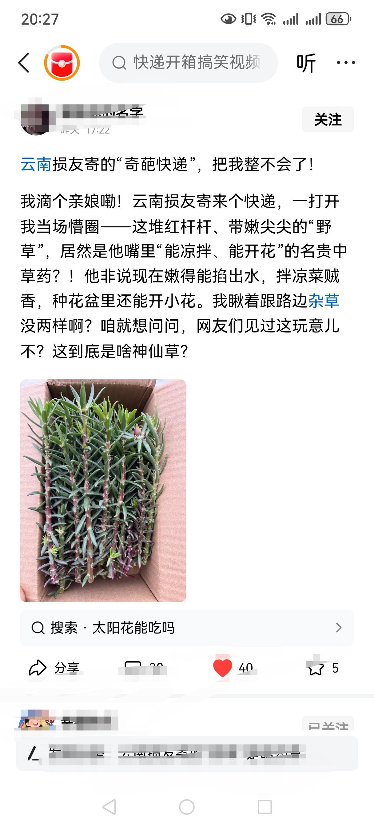 刚刚收拾好厨房,打开头条看看网友们的文章,和一个友友聊完“云南网友寄过来的奇怪的草,请广大网友看看是什么草?”我和各路友友想法一样,是“太阳花”,文章互动还挺高。 结果,再往下拉,又看到一篇同样的文章,问网友“云南的损友寄过来的奇怪的草,让大家告知一下是什么草?”两篇文章图片包装纸箱都一样,网友们互动很积极,都猜“太阳花”。 我以为我眼花了呢,明明已经和友友互动过了啊?怎么又被推送一次。 不晓得这算什么?哈哈,估计这个季节云南的友友喜欢快递这个“神仙草”吧,哪位友友也给我寄点“太阳花”,我过几天再写它,哈哈哈。