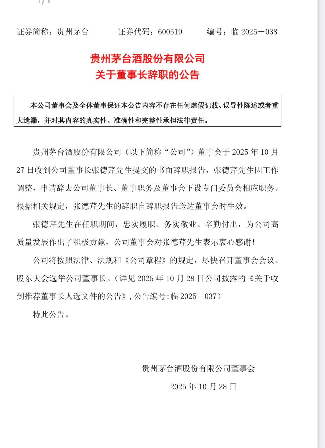 茅台公告董事长辞职。新人新气象,股价涨一涨。