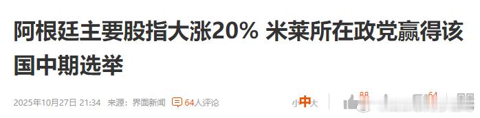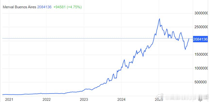 阿根廷主要股市指数Merval于2025年10月24日上涨至2084871点,较前一交易日增长1.43%。过去一个月,该指数上涨了17.93%,与去年同期相比上涨了11.32%,根据跟踪该阿根廷基准指数的差价合约(CFD)交易数据。 历史上,阿根廷股市(MERVAL)于2025年1月达到了2867774.50的历史最高点你看好米莱ma