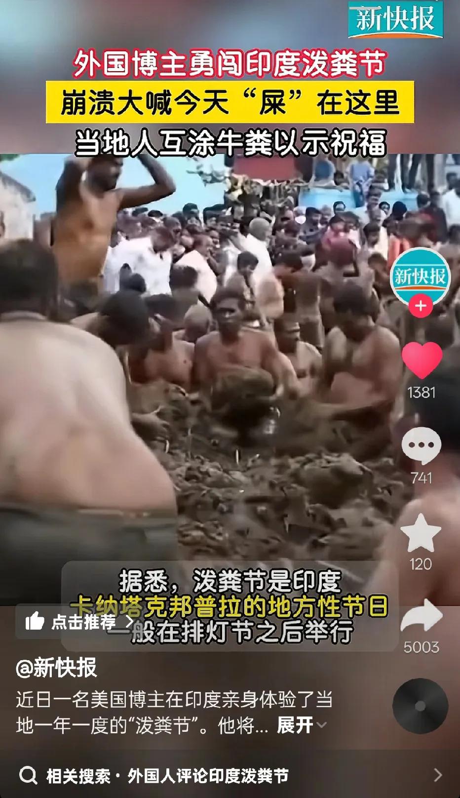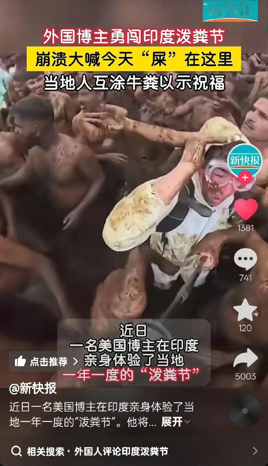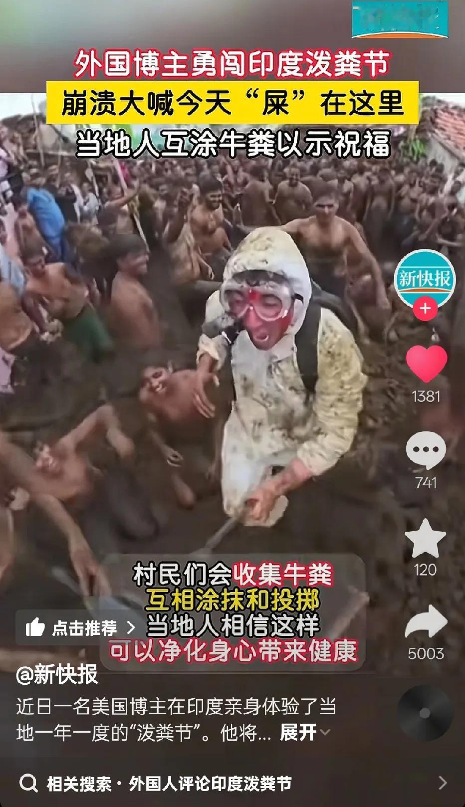 “扔嘴里咋办”……第一次听说“泼粪节”,印度太神奇了,一群人互相涂抹和投牛粪!牛🐮!一位外国小哥勇闯印度泼粪节,一路被砸牛粪,还敢张嘴,我看到有网友评论说:他还敢一路张嘴,是个狠人,牛粪丢嘴里怎么办?[捂脸] 还有一网友问:会不会混进去人的💩? 底下有一个人回答:包的。。。[捂脸] 甚至还有人说:进入场地一分钟,出来吃饱了[微笑],牙缝里还有些许残留物。 哈哈,网友们太能整活了,被这些天赋型选手的留言笑喷了。 如果有机会去参加这种节日,你会去吗?