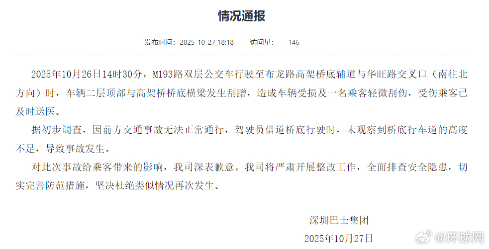 【#深圳通报双层公交刮蹭高架桥#】双层公交顶部刮蹭高架桥桥底横梁,深圳巴士集团通报:一名乘客轻微刮伤,驾驶员借道桥底时未观察到高度不足所致